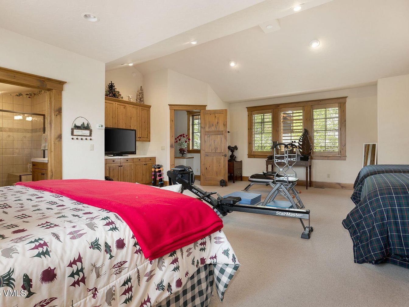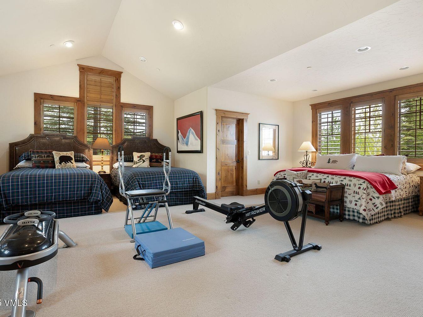 This large bedroom combines comfort and functionality featuring neutral beige carpeting and soft cream walls accented by warm natural wood trims and doors. Two beds with cozy, patterned bedding bring a rustic charm, while the red blanket adds a cheerful pop of color. A rowing machine and workout equipment occupy one side of the room, integrating fitness into daily living. The wooden cabinetry houses a flat-screen TV, with decorative elements softly placed atop. Ample natural light filters through wide shutters on three windows, brightening the space with an inviting, tranquil ambiance.