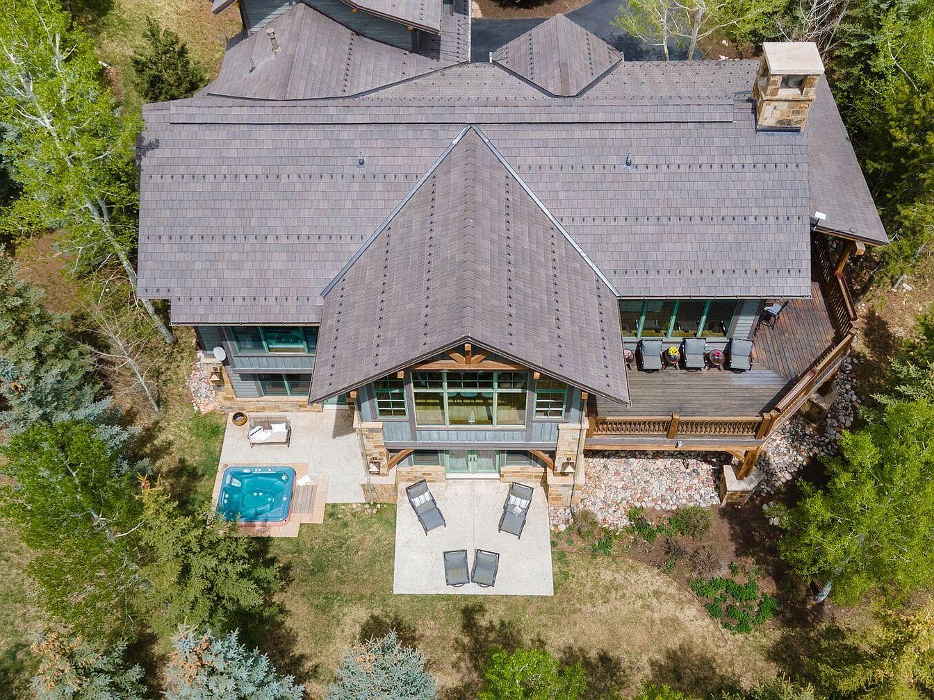 This backyard area features a multi-level wooden deck extending from the house, complemented by a spacious concrete patio below. The deck includes several reclining chairs perfect for outdoor relaxation, overlooking a serene, wooded backyard. On the patio, a cluster of four lounge chairs faces outward, inviting social gatherings or quiet sunbathing. Adjacent to the patio, a built-in hot tub adds a luxurious touch. The house showcases natural stone and wooden architectural elements, with large windows allowing views of the yard. The earthy tones of the roofing and siding blend harmoniously with the surrounding greenery, creating a cozy yet elegant outdoor retreat.