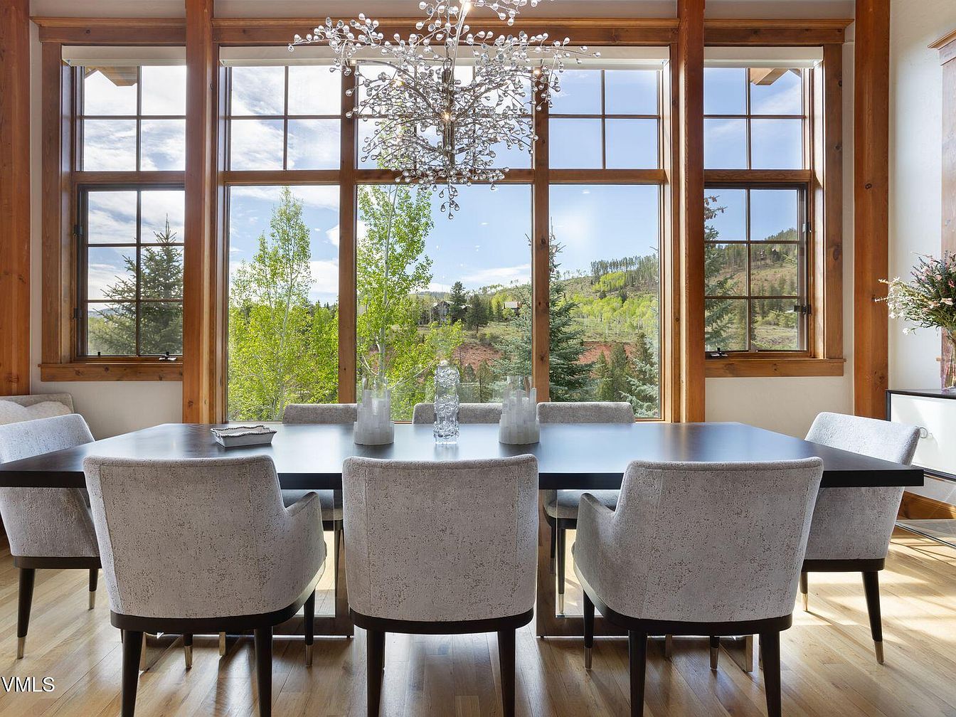 This elegant dining space centers around a sleek, dark rectangular table surrounded by eight upholstered armchairs in a soft, textured gray fabric. Floor-to-ceiling windows framed in warm wood dominate one entire wall, providing panoramic views of lush green trees and distant hills. Natural light floods the room, enhancing the light wooden floor that complements the window frames. A sophisticated, sculptural chandelier with delicate crystal-like droplets hangs centrally, adding sparkle and a modern touch. The space balances contemporary comfort and rustic charm, creating a warm, inviting atmosphere perfect for gatherings that enjoy both indoor refinement and outdoor beauty.