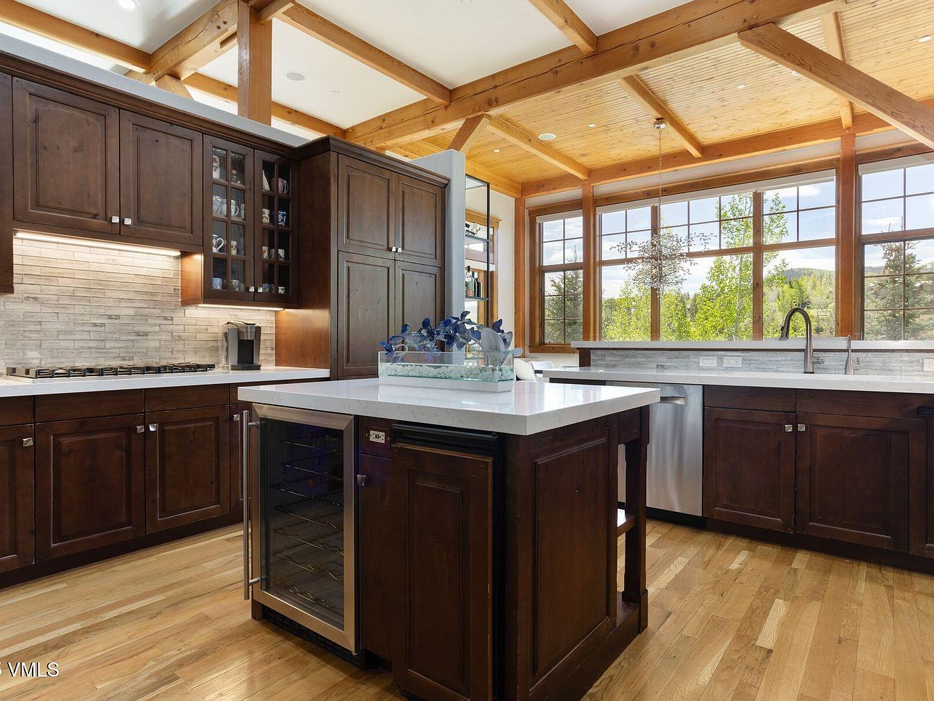 This spacious kitchen features rich, dark wood cabinetry contrasted by light-colored stone countertops that add brightness and balance. The open layout centers around a large island, equipped with a wine refrigerator and adorned with a minimalist decorative centerpiece. Hardwood floors complement the exposed wooden beams and ceiling, enhancing the warm, rustic atmosphere. A wall of expansive windows floods the space with natural light while offering picturesque views of lush greenery outside. Modern stainless steel appliances and sleek fixtures add a contemporary touch to this inviting culinary environment.