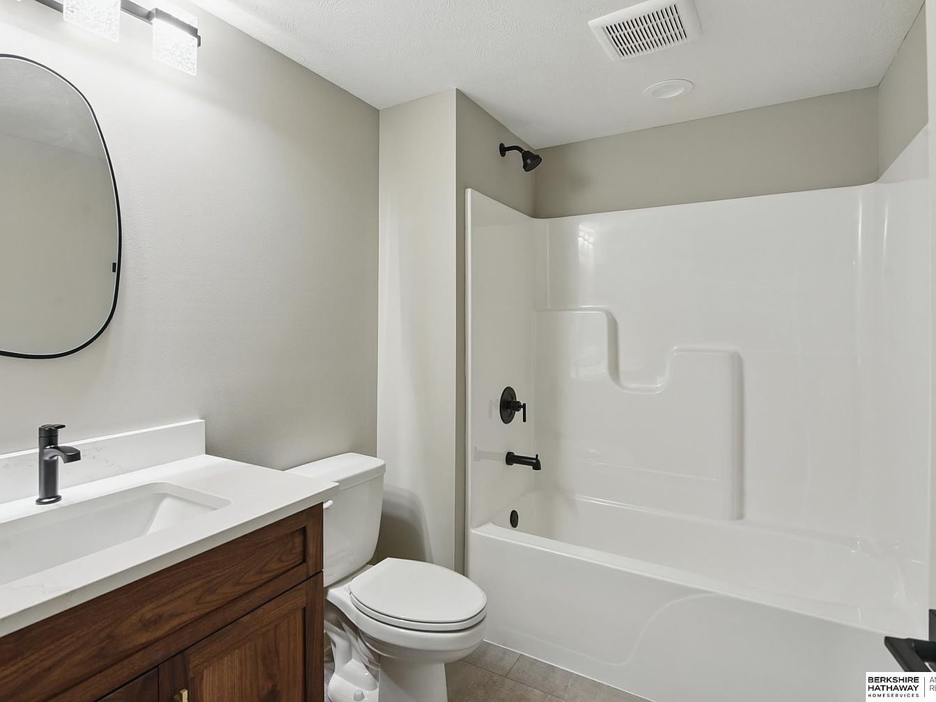 This bathroom features a clean, modern layout with a calming neutral color palette of soft grays and white. A sleek white bathtub and shower surround contrasts with matte black fixtures, lending a contemporary touch. The vanity showcases warm wooden cabinetry topped with a white countertop and an integrated under-mount sink, enhanced by a black faucet. The oval mirror above the sink complements the smooth minimalist design, while soft light filtering from the window creates an inviting atmosphere. The simple tile flooring and ceiling vent add practicality without detracting from the understated elegance.