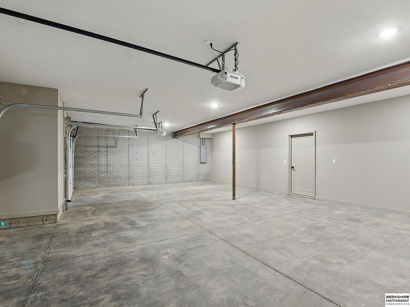 This spacious garage features a utilitarian design with polished concrete flooring and light gray walls that evoke a clean, industrial vibe. The ceiling is equipped with multiple garage door openers and metal track systems to facilitate vehicle entry and exit. A prominent exposed steel support beam runs horizontally across the ceiling, supported by a vertical steel post, adding architectural interest and structural integrity. One door on the right wall provides interior access to the home, while a large gray cinder block wall anchors the far end of the space, emphasizing durability. Minimalist and practical, this garage balances function with subtle industrial charm.