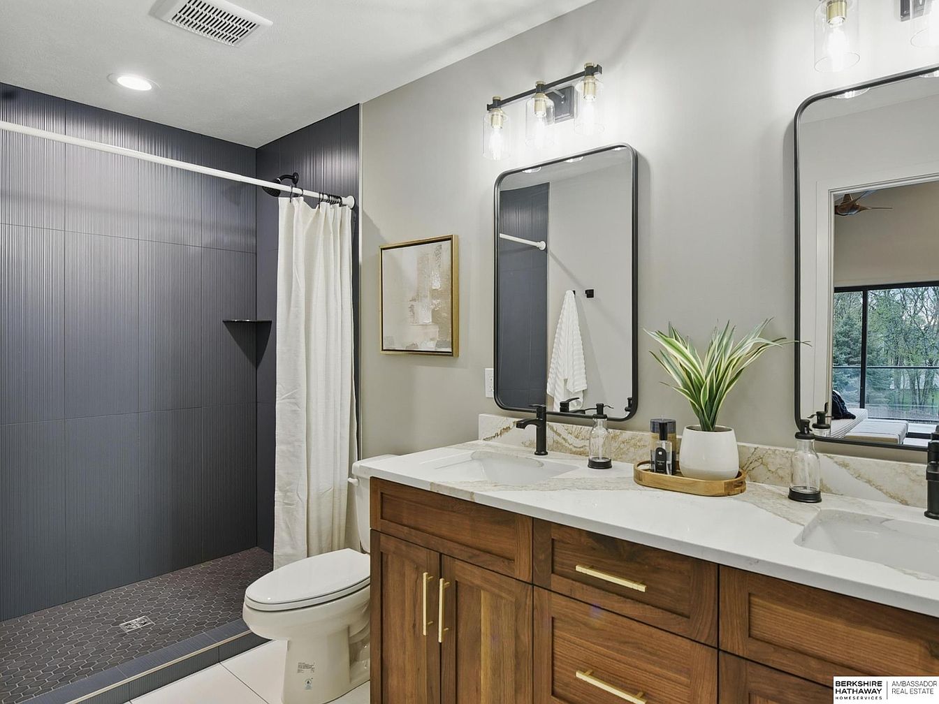 This serene bathroom features a modern double vanity with rich wooden cabinetry accented by sleek brass handles. The countertop is a polished light marble with subtle veining, providing a touch of elegance. Two large rectangular mirrors with rounded edges hang above each sink, framed in black to complement the black matte faucets. Above the mirrors, a trio of vintage-style glass light fixtures adds warmth. The walk-in shower boasts dark gray vertically textured tiles and hexagonal floor tiles, paired with a white shower curtain. Neutral wall tones and a simple framed artwork complete the calming, contemporary aesthetic.