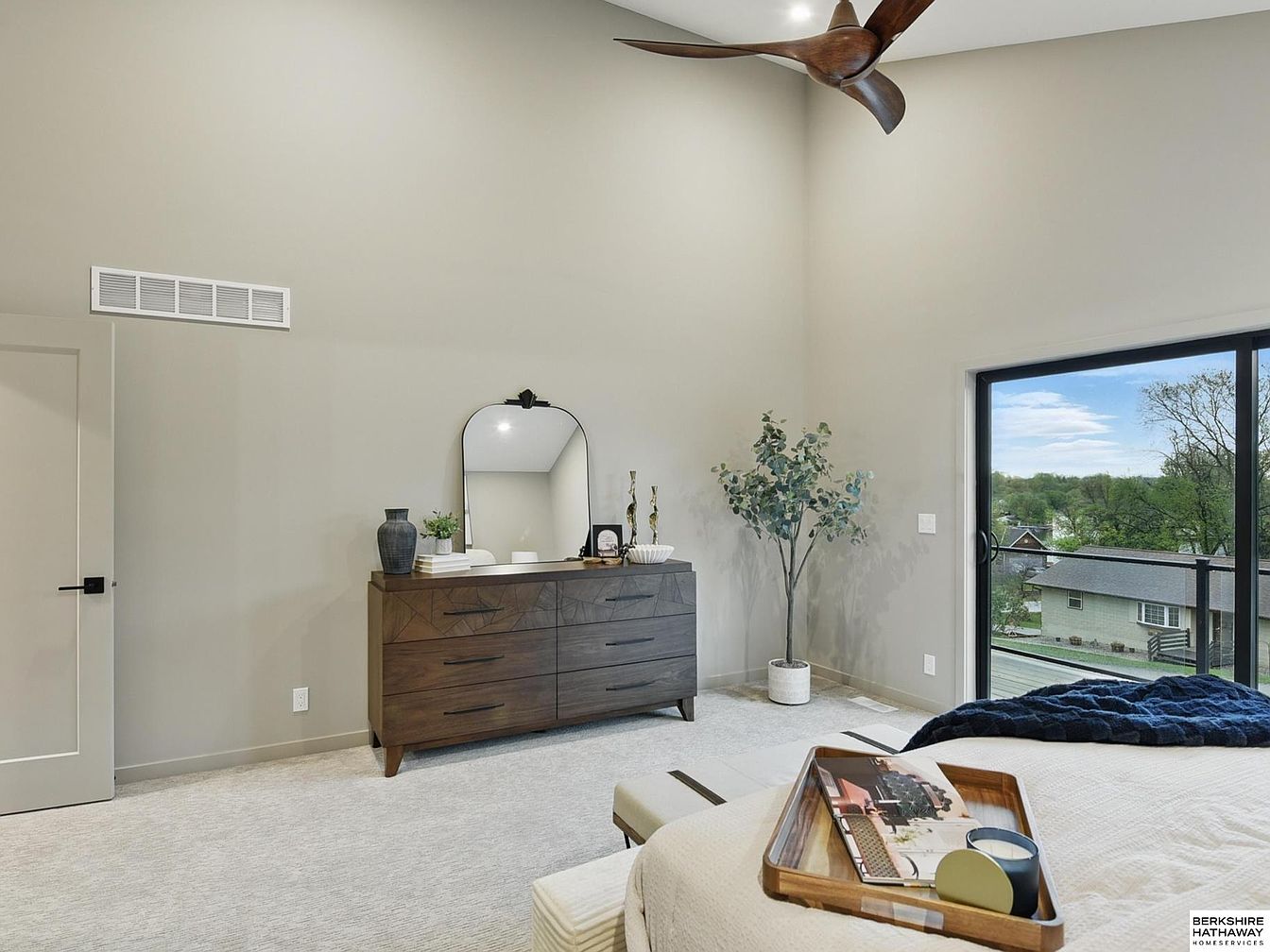 This serene bedroom features high ceilings and a neutral color palette dominated by soft beige walls and light carpeting, creating an airy and calming atmosphere. A large sliding glass door opens to a balcony, inviting natural light and offering lush greenery views. The room is simply yet stylishly adorned with a dark wood dresser topped with a modern arch mirror, decorative vases, and greenery adding subtle texture and life. A ceiling fan with sculptural wooden blades adds a natural element. The bed includes a wooden tray with magazines and a candle, emphasizing comfort and relaxation.