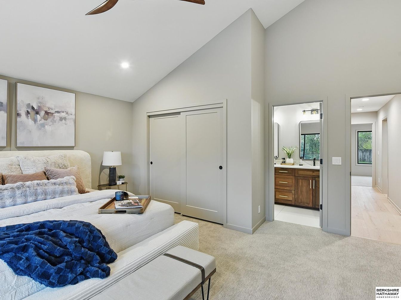 This master bedroom features a calming neutral palette of soft grey walls and beige carpeting that enhances its cozy ambiance. The large bed is adorned with textured pillows and a deep blue throw, complemented by abstract wall art above the headboard. A modern bedside table with a sleek lamp provides practical lighting. The room showcases a spacious closet with sliding doors, maximizing closet accessibility. A doorway leads into a bright en suite bathroom, highlighted by wood cabinetry and a large mirror, while an adjacent hallway offers a glimpse of natural light from an additional window, emphasizing openness and flow.