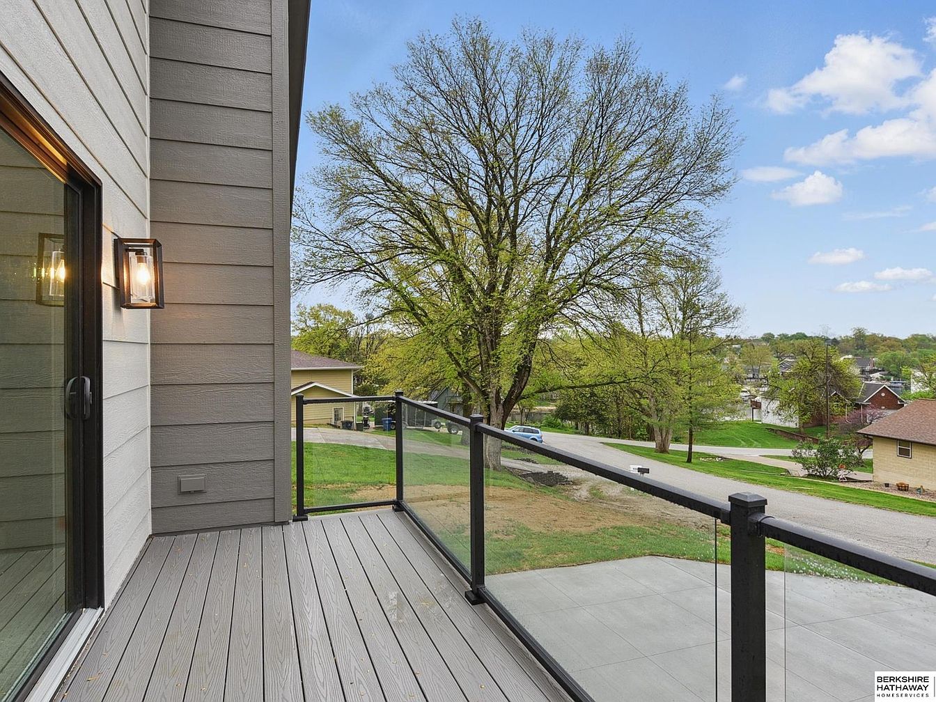 This balcony features contemporary design with clean lines and durable composite decking in a soft gray tone, adding a modern feel. The railing incorporates black metal posts with clear glass panels, providing unobstructed views of the lush greenery and quiet neighborhood street beyond. The exterior wall siding is painted in muted gray hues, complementing the balcony’s subtle palette. A sleek industrial-style wall light fixture next to the sliding glass door offers warm illumination, creating a cozy ambiance for evening enjoyment. The expansive outlook includes mature trees and distant rooftops, blending nature with residential charm.