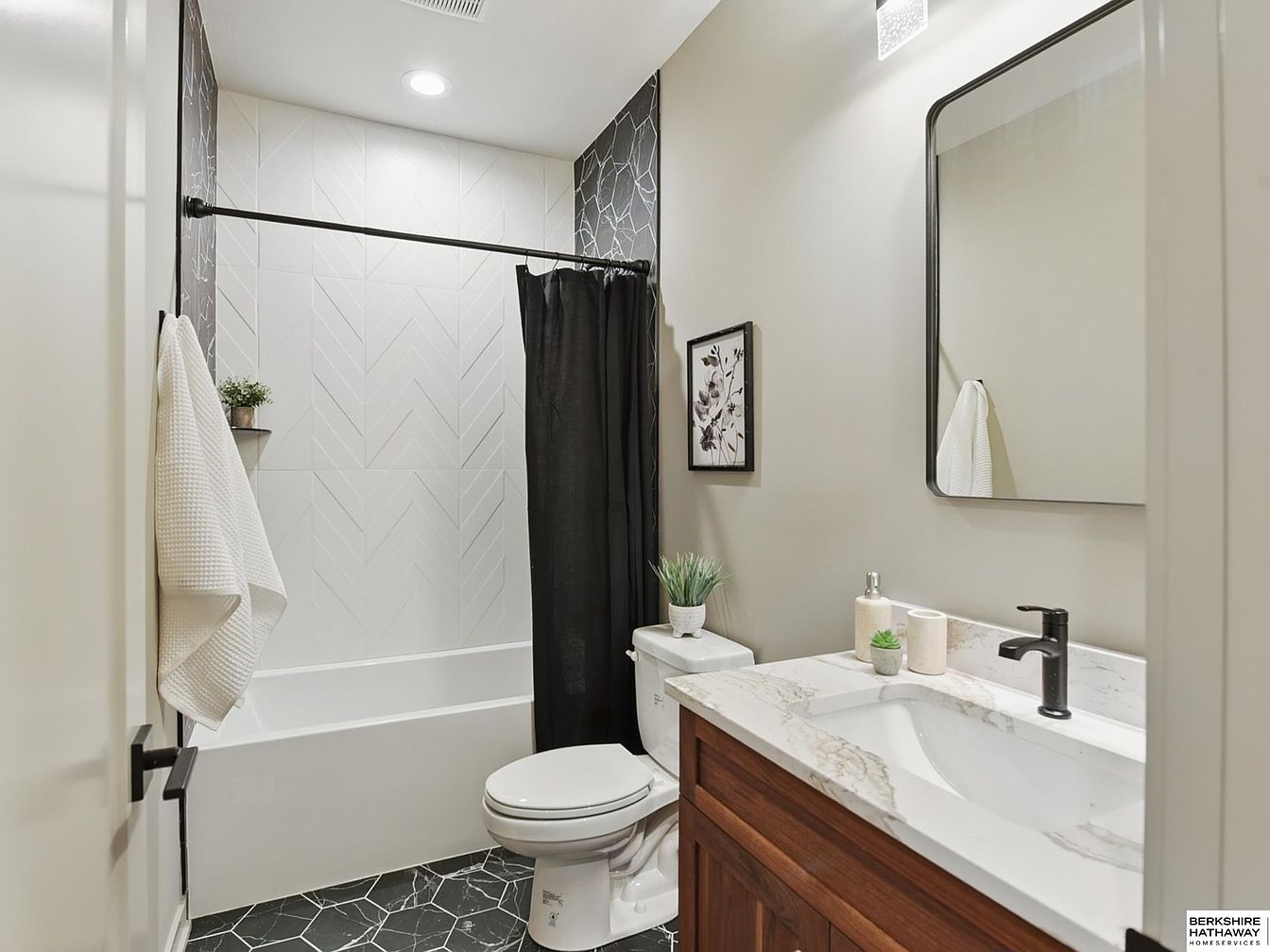 This bathroom features a sleek, modern layout with a refined color scheme of black, white, and warm wood tones. The black hexagonal floor tiles extend partially up the walls, contrasting against bright white tiles in a chevron pattern inside the bath area. A simple black shower curtain complements the tiles, adding depth. The vanity includes a rich wooden cabinet topped with white marble countertop with subtle veining, and a matte black faucet adds contemporary flair. A rectangular mirror with a black frame hangs above, paired with delicate botanical wall art, finishing this clean, sophisticated space.