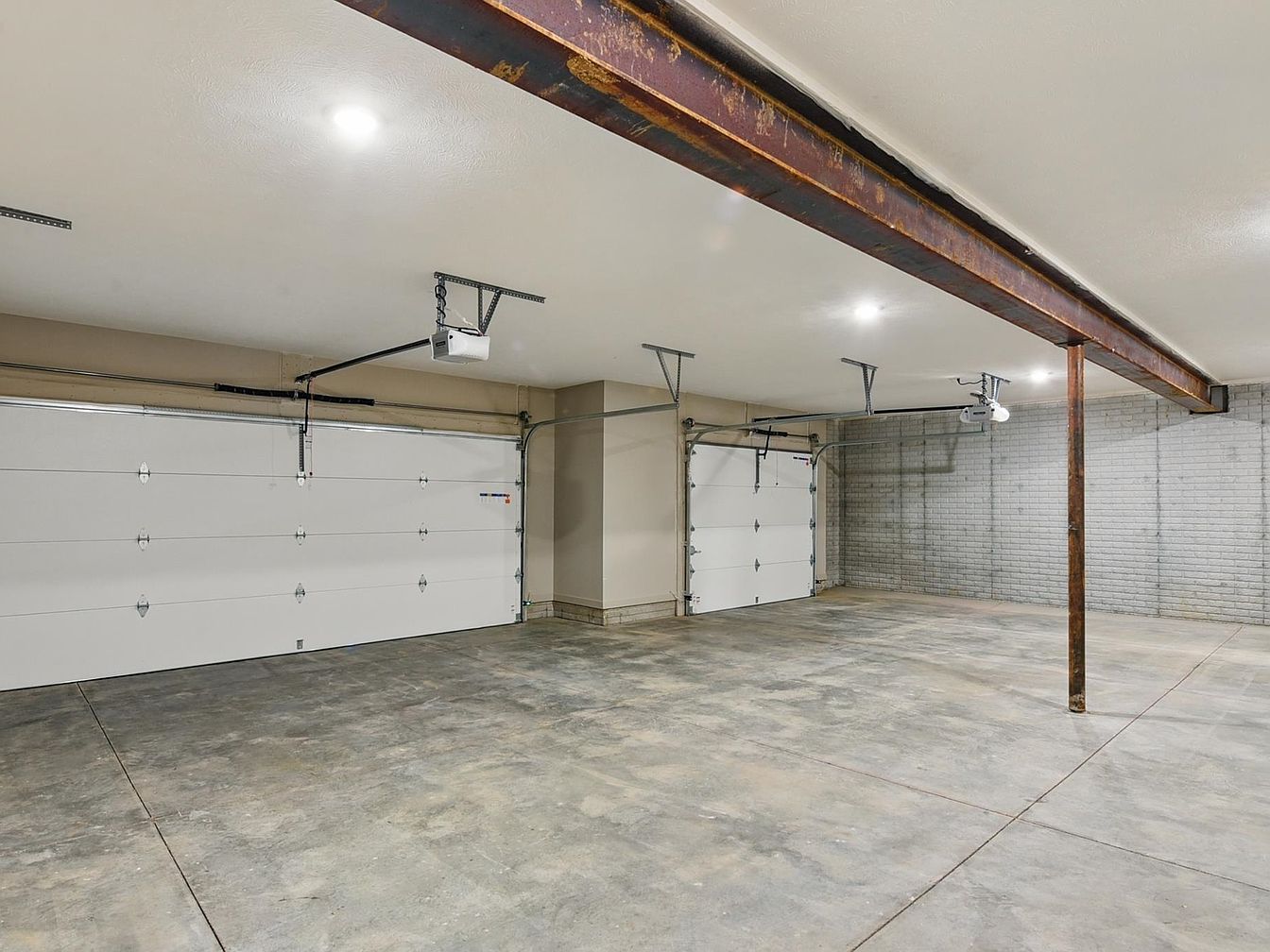 This spacious garage features a functional layout with two white sectional automatic doors for easy vehicle access. The floor is polished concrete, lending a durable and industrial feel, complemented by exposed support beams and columns with a rustic, weathered patina. Neutral beige walls and a white ceiling with bright recessed lighting keep the area well-lit and practical. One wall is finished with white brick, adding texture and visual interest to the otherwise utilitarian space. Ample room is provided for multiple vehicles or additional storage, making it highly versatile for homeowners.