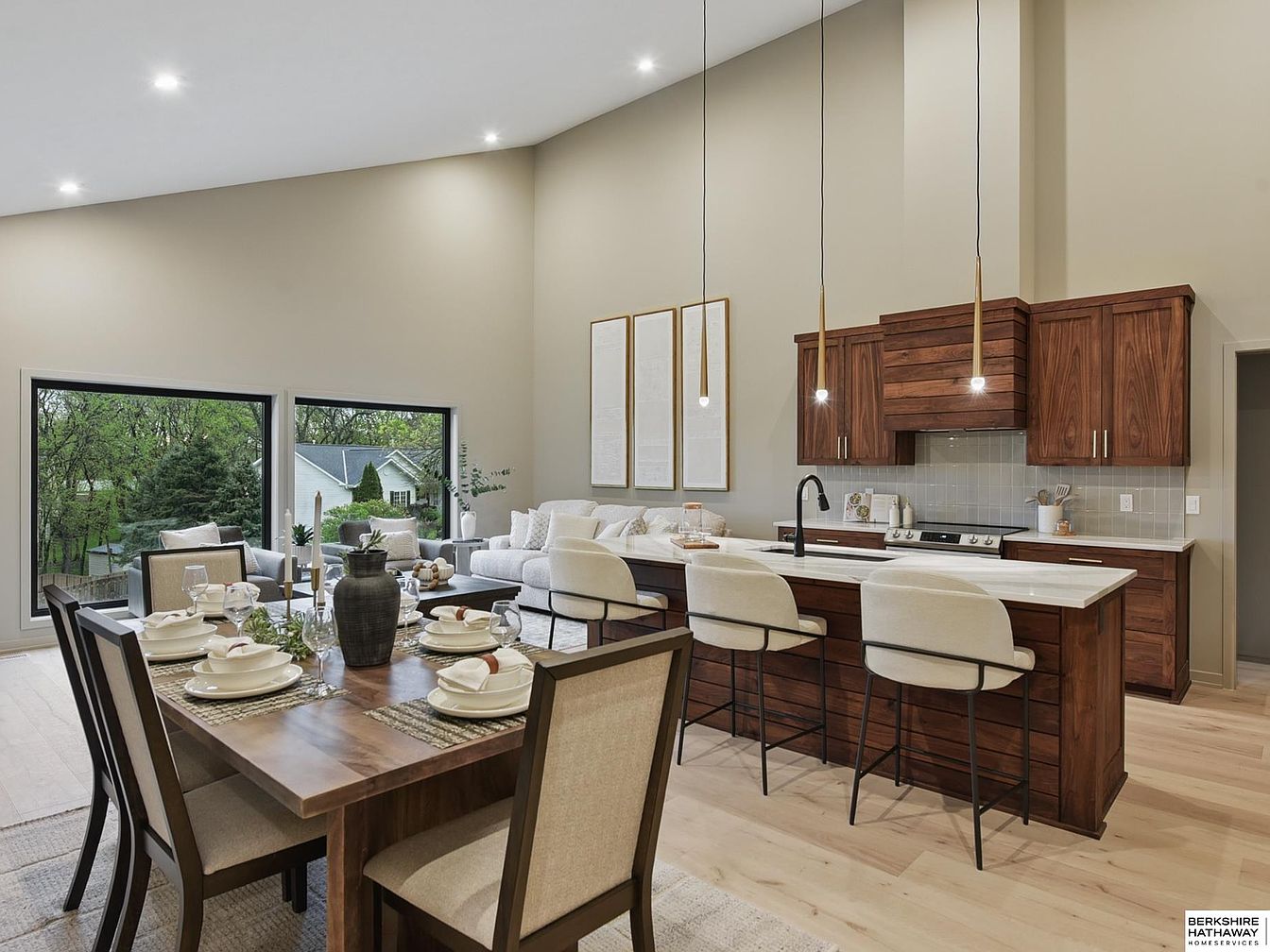 This spacious open-plan kitchen and dining area features a warm and inviting atmosphere with natural wood tones and neutral colors. The kitchen showcases rich, dark wood cabinetry with a modern white countertop island that extends into a breakfast bar with cushioned, cream-toned stools. Pendant lights with slender wooden accents hang above the island adding elegant warmth. The dining table matches the dark wood cabinetry, surrounded by beige upholstered chairs that complement the light wood flooring. Large windows bring in ample natural light and frame a view of lush greenery outside. The adjacent cozy living area contains a white sectional sofa and abstract wall art, completing the sophisticated, cohesive space.