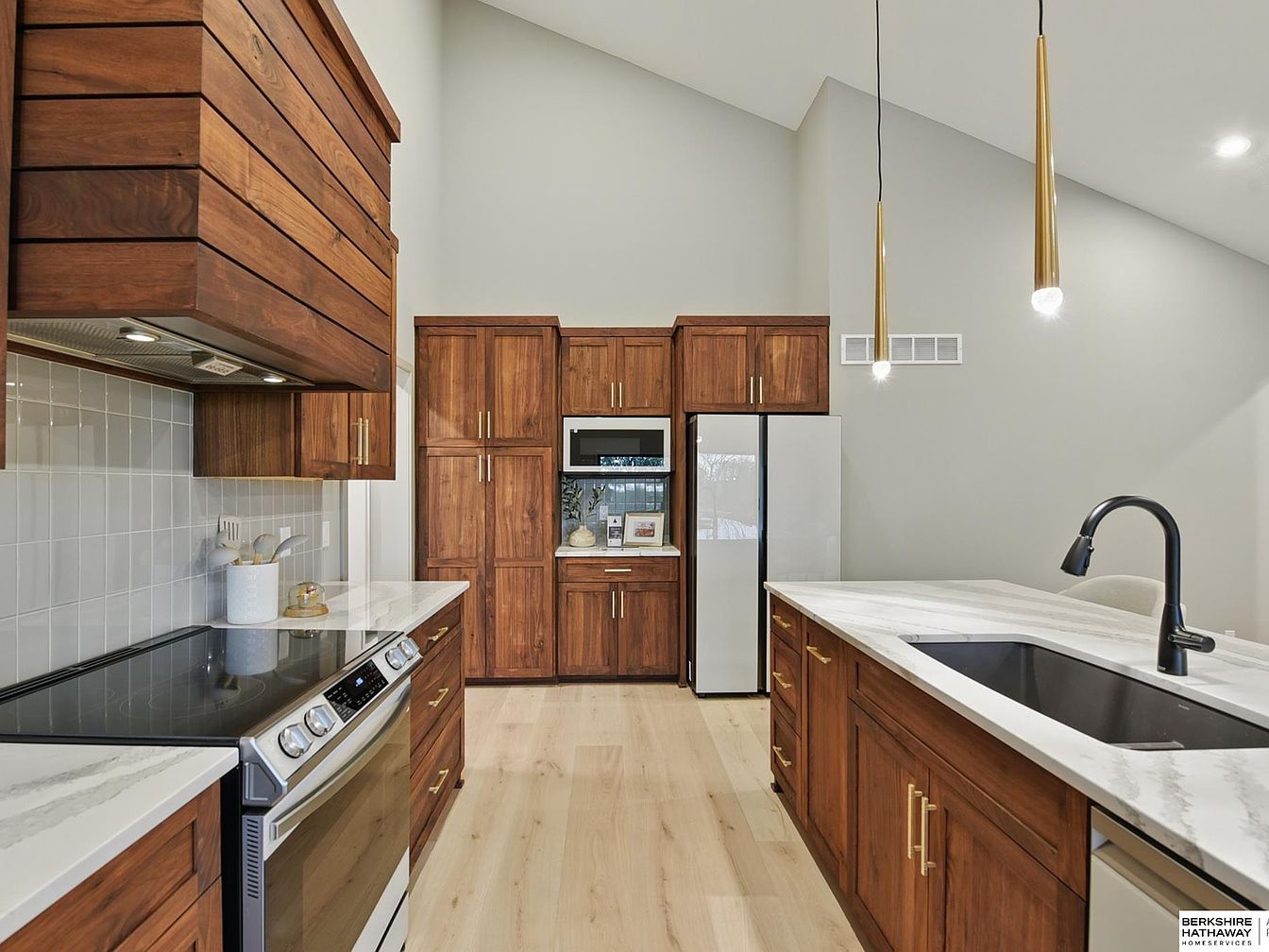 This kitchen features a sleek, contemporary design with warm wood cabinetry contrasted by a light, airy color palette. The space includes a central island with a white marble countertop and integrated black sink, accented by modern matte black fixtures. Above the island hang two striking elongated brass pendant lights that add a touch of elegance. The kitchen is framed by full-height wood cabinets with brass handles, a built-in microwave nook, and a glossy white refrigerator. The light wood flooring and soft gray walls maintain a neutral, calming backdrop while vaulted ceilings enhance the room’s openness and light.