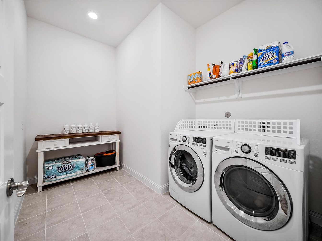 This spacious laundry room features a clean, minimalist design with white walls and light beige tiled floors that enhance brightness. A matching white front-load washer and dryer set sits side by side beneath a simple white shelf stocked with various cleaning supplies. Adjacent to the appliances, a rustic-style white cabinet with a dark wooden top offers additional storage, holding household essentials like paper towels and detergent below. The ceiling’s height and recessed lighting create an airy, well-lit atmosphere, ensuring that this functional space is both practical and visually uncluttered.