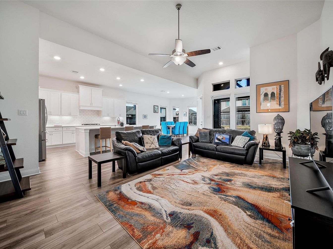 This spacious living area features an open layout seamlessly connecting the kitchen, dining, and living spaces. The room is bright and airy, highlighted by high vaulted ceilings and recessed lighting. Neutral tones dominate, with white walls and cabinetry contrasting against warm wood-look flooring and sleek black leather sofas. The area rug introduces a dynamic splash of earthy colors including rust, cream, and blue, adding personality and warmth. Large windows flood the space with natural light, while a ceiling fan adds a functional, modern touch. Thoughtful decor includes patterned cushions, framed artwork, and ornamental sculptures, creating a balanced and inviting atmosphere.