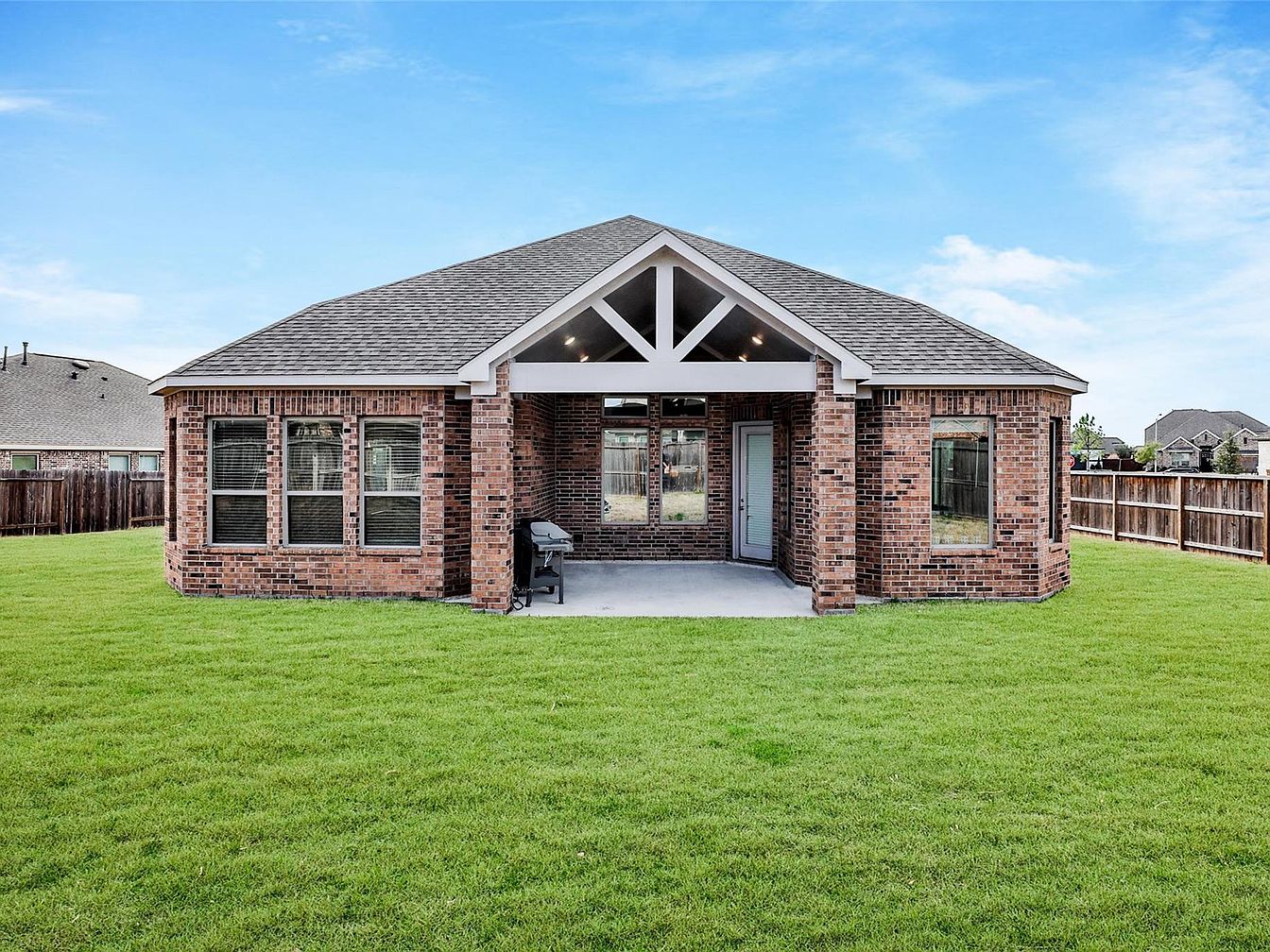This backyard patio features a spacious covered seating area with a peaked roof showcasing clean white beams that contrast beautifully against the warm red brick exterior of the house. The symmetrical layout includes multiple large windows flanking the patio space, allowing ample natural light to enter the interior. A concrete floor anchors the outdoor area, which currently holds a barbecue grill, inviting a relaxed, social atmosphere. Lush green grass surrounds the patio, enclosed by a wooden privacy fence, creating a serene, private outdoor space perfect for entertaining or peaceful relaxation.