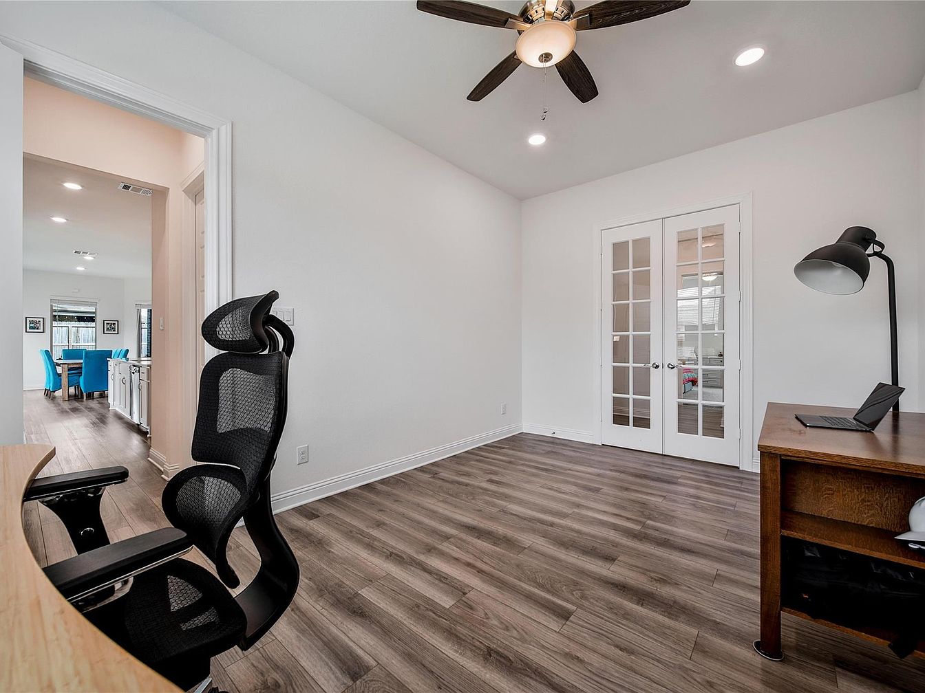 This home office features a spacious layout with modern design elements. The flooring consists of warm wood planks that add natural texture to the room. Walls are painted in a crisp white, contributing to a clean, bright atmosphere. The ceiling fan with dark wooden blades and light fixture serves both function and style. A large ergonomic black office chair and a wooden desk with a sleek black lamp are positioned near French doors with glass panels, allowing natural light and visibility to adjacent spaces. The space balances comfort and professionalism perfectly.