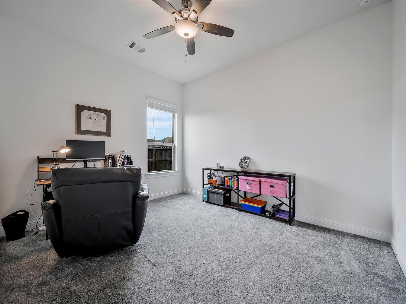This cozy yet functional home office features a simple layout with a black leather chair positioned in front of a compact wooden desk. The desk is organized with a computer monitor, desk lamp, and office supplies. The room is painted in a clean, neutral white which contrasts softly with the plush, light gray carpeting. A small black metal shelving unit with open cubbies holds colorful storage boxes and books, adding a playful touch. A ceiling fan with dark wooden blades complements the minimalist, practical aesthetic while providing comfort and air circulation. A window offers natural light and a view of the outdoors.