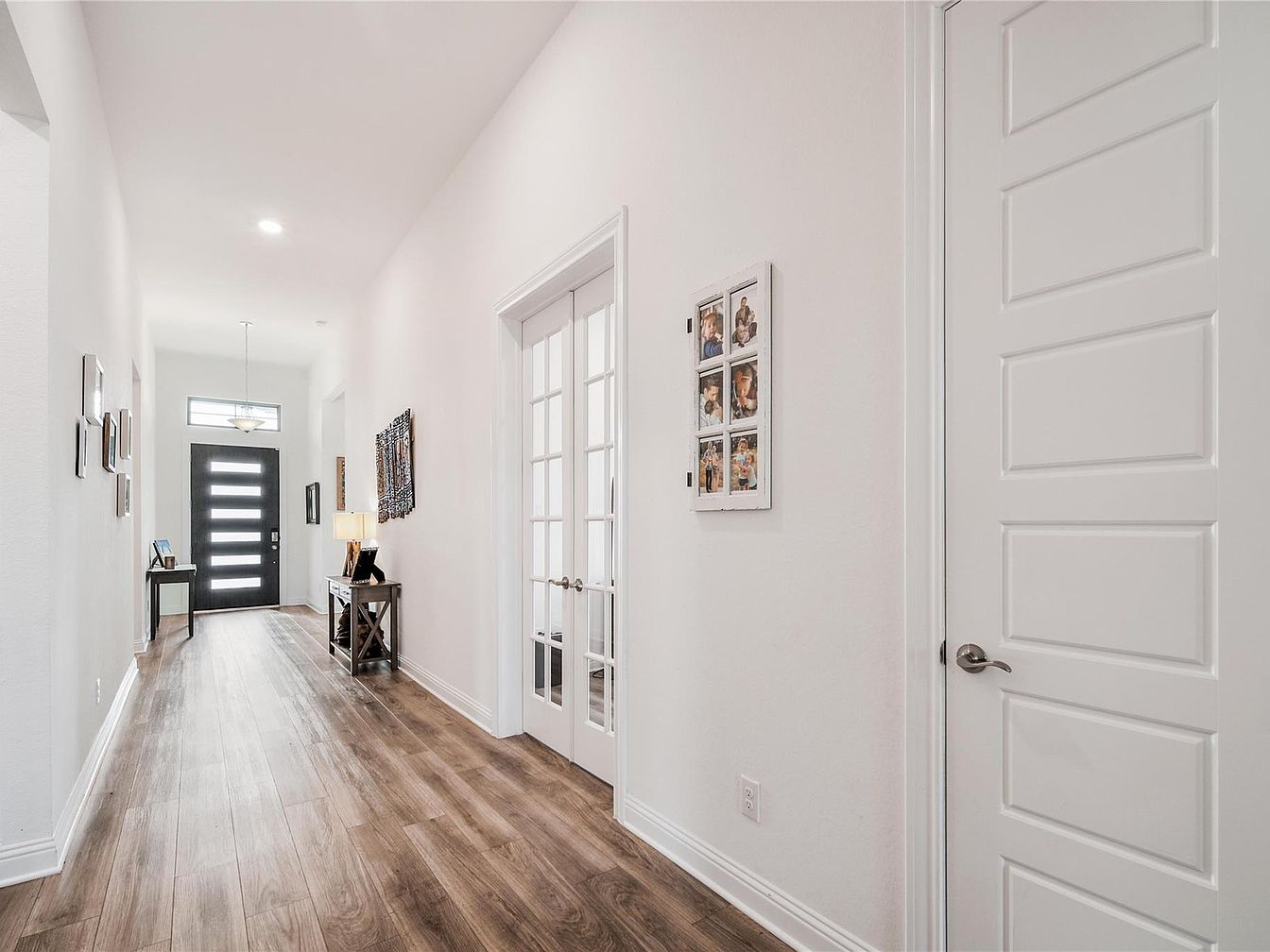 This entryway features a long, narrow layout with rich wood-look flooring that adds warmth and texture against the crisp white walls. A modern black front door, punctuated by horizontal frosted glass panels, introduces a striking contrast while allowing natural light to filter through. Along one wall, small framed photos and art pieces inject personality and charm. A console table with a lamp and decorative accents enhances the welcoming ambiance. White paneled doors and glass French doors create a refined, open feel and connect to adjoining rooms with understated elegance.