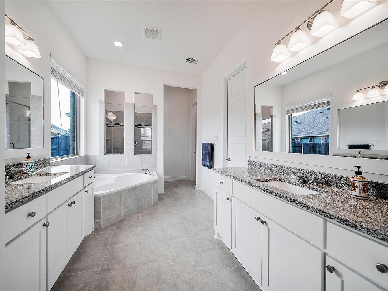 This master bathroom features a bright, spacious layout with white walls and light gray tiled flooring that extends to the bathtub surround. Dual granite countertops with under-mount sinks are set atop white cabinetry, offering ample storage. Large mirrors above each vanity enhance the sense of space, while sleek metal fixtures and polished hardware add subtle contrast. Recessed lighting and two modern light bars over each sink provide warm illumination. A large window brings in natural light, and three vertical mirrors above the corner soaking tub add architectural interest. The clean, contemporary design emphasizes functionality and elegance.