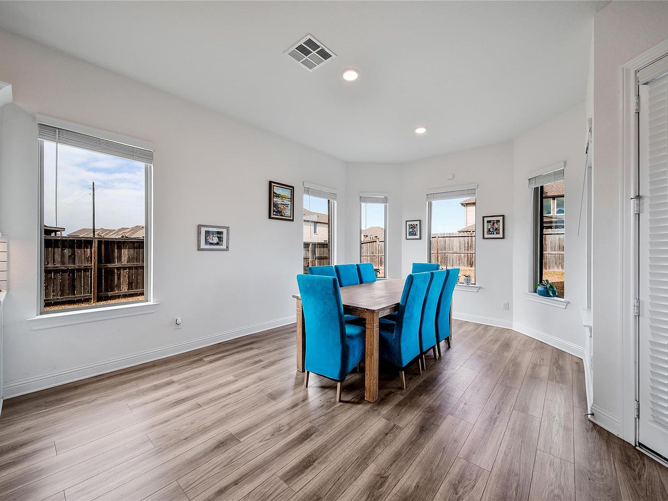 This dining space features a rectangular wooden table surrounded by eight vibrant blue upholstered chairs, adding a striking pop of color against the neutral backdrop. The walls are painted crisp white, enhancing brightness and spaciousness. Multiple windows on three sides bring in ample natural light, offering views of a fenced backyard and neighboring homes. The flooring consists of wood-look laminate planks in a warm gray tone, complementing the modern minimalist aesthetic. Recessed ceiling lights provide additional illumination, and subtle framed artwork adds a touch of personality without overwhelming the clean, airy feel.