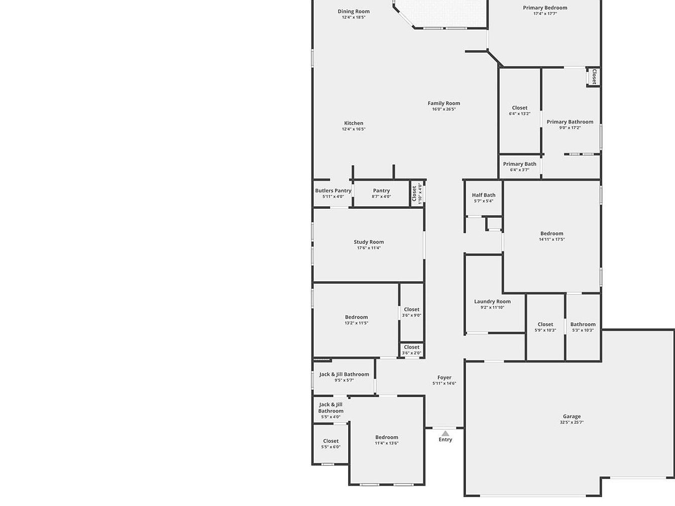 This spacious, well-organized floor plan highlights a thoughtful layout featuring multiple bedrooms and bathrooms, ideal for a family. The centrally positioned kitchen flows seamlessly into the large family room, fostering an open living environment. A dedicated study room offers privacy and functionality, while the primary suite enjoys ample space with a connected bath and generous closet. Additional highlights include a butler’s pantry, laundry room, and multiple closets enhancing storage. The attached garage is expansive, and various Jack & Jill bathrooms cater to bedrooms, emphasizing convenience and modern living needs throughout the home.