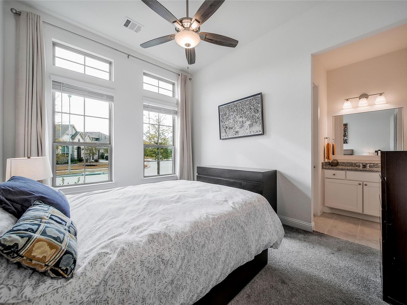 This serene master bedroom features a neutral color palette dominated by soft whites and subtle gray tones. The large windows with white frames invite abundant natural light, enhancing the airy, spacious feel and offering a pleasant view of the neighborhood outside. A modern ceiling fan with dark blades contrasts elegantly with the white ceiling. The bed is dressed in a delicate patterned white duvet, complemented by blue and patterned accent pillows adding a touch of color. Opposite the bed stands a sleek black dresser, while an open doorway leads to a well-lit bathroom with granite countertops and white cabinetry, adding to the sophisticated yet cozy atmosphere.