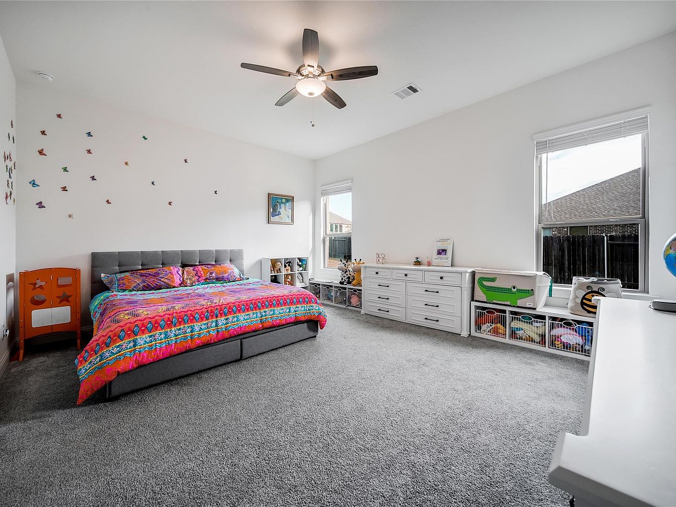 This bright children’s bedroom features a spacious layout with light gray carpeting and white walls, creating an airy and clean atmosphere. A large window on the right allows natural light to flood the room. The gray upholstered bed acts as a neutral anchor, accented by a colorful, vibrant patterned bedspread in pink, orange, and blue hues. A playful touch is added by the multicolored butterfly wall decals above the bed. Storage solutions include a white dresser, cubby shelves with toys, and bins with whimsical animal designs, blending functionality with child-friendly aesthetics. A contemporary ceiling fan with dark wood blades completes the room.