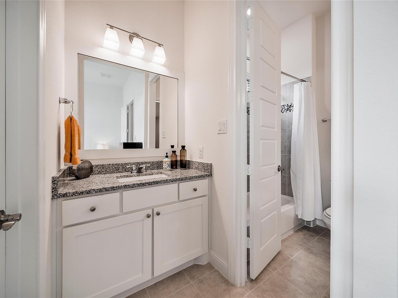This bathroom features a clean, functional vanity space with white cabinetry and a grey granite countertop. The large rectangular mirror extends the visual space above the sink, complemented by a modern three-light fixture with frosted shades that cast soft illumination. Neutral beige floor tiles enhance the earthy tones of the countertop while maintaining the room’s light, airy feel. A small door to the right leads into a shower and bathtub area, distinguished by light grey tiles and a decorative mosaic band. A white shower curtain adds simplicity and cohesion to the space’s contemporary design.