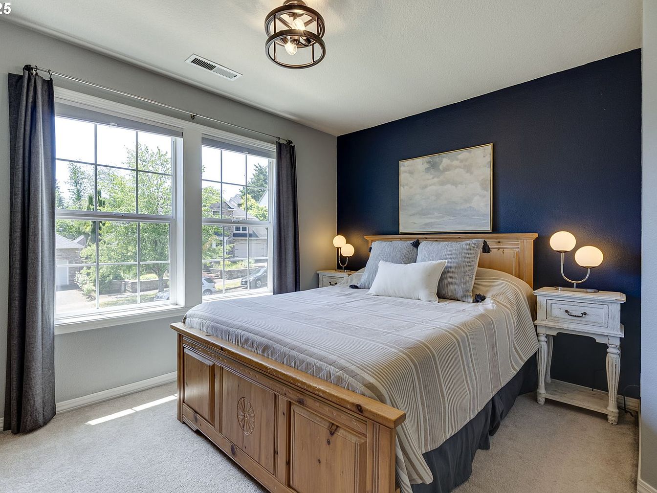 This serene master bedroom features a spacious layout with a large wooden bed frame as the focal point, complemented by a cozy striped bedspread in neutral tones. A deep navy accent wall behind the bed adds depth and contrast, balancing the otherwise soft, light color palette of gray walls and carpeted flooring. Flanking the bed, two distressed white nightstands with compact drawers support modern spherical lamps that provide warm, inviting lighting. Large windows dressed with dark curtains bring in abundant natural light, enhancing the airy and restful atmosphere of the space. A calming cloudscape painting adds a subtle touch of art, completing the room’s relaxed, elegant aesthetic.