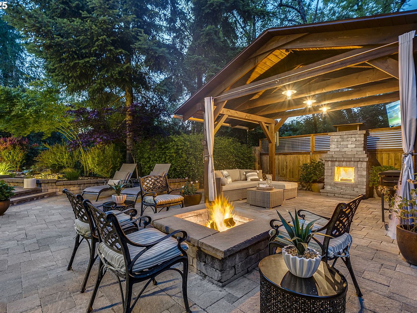 This inviting outdoor patio is designed for comfort and social gatherings, featuring a central stone firepit surrounded by four wrought iron chairs with striped cushions. The flooring consists of neutral-toned paving stones that complement the natural wood of the covered pergola structure overhead, which is enhanced with warm hanging lights creating a cozy ambiance. Adjacent to the firepit area is a comfortable sectional sofa with neutral cushions, positioned near a brick fireplace that adds extra warmth and visual interest. Lush greenery and mature trees frame the patio, blending nature with the elegant, rustic outdoor living space.