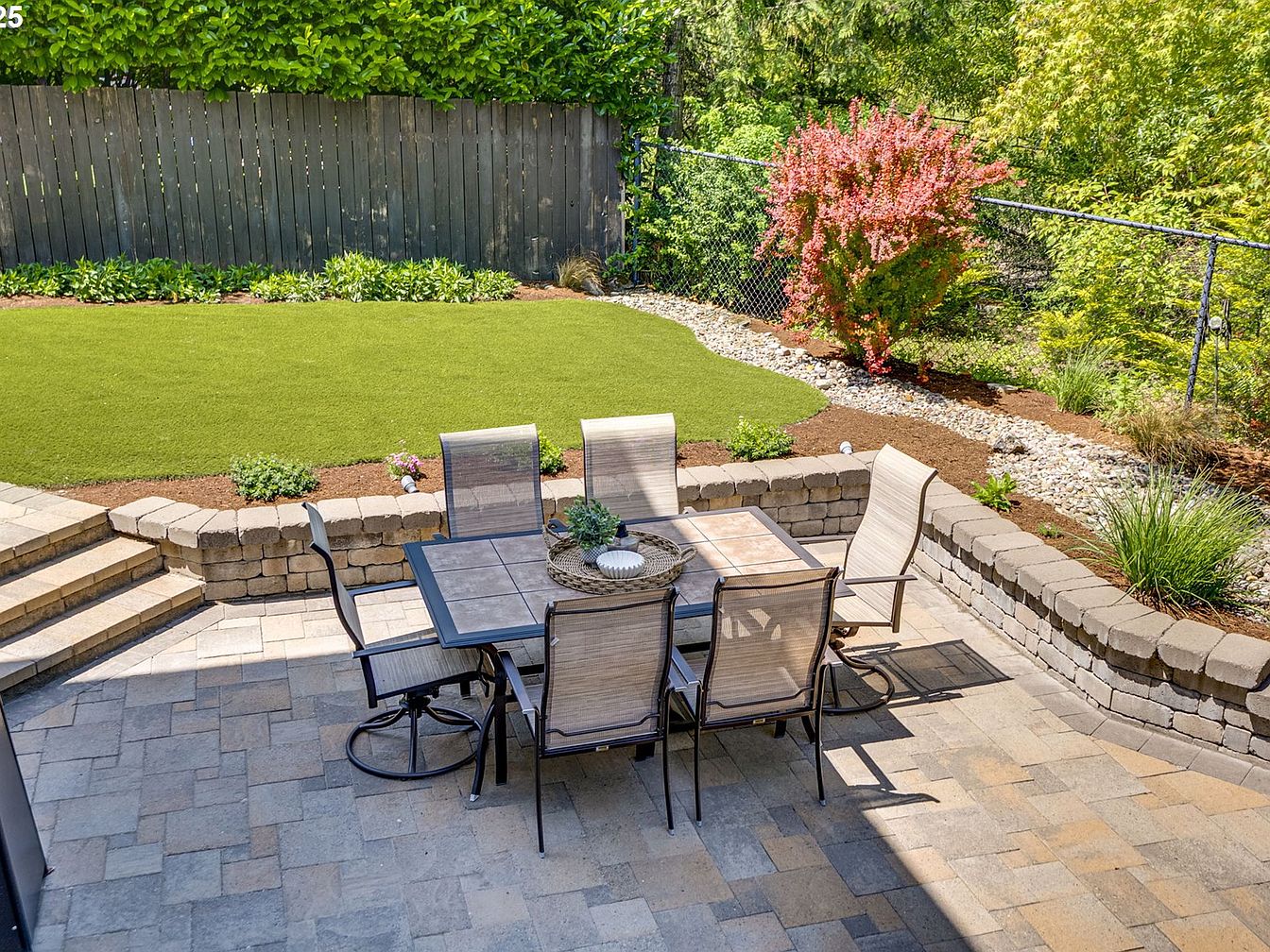 This outdoor space features a paved stone patio with a neutral color palette of beige and gray tones arranged in a subtle pattern, creating a warm and inviting foundation. A rectangular dining table with a tiled tabletop is surrounded by six airy mesh chairs in complementary beige hues. The patio is bordered by a low retaining wall made of stacked stone blocks, adding texture and structure while enclosing lush greenery and a vibrant red shrub that brings a pop of color. The backyard beyond includes a neatly trimmed lawn and is enclosed by a wooden fence and chain-link fencing, offering both privacy and openness.