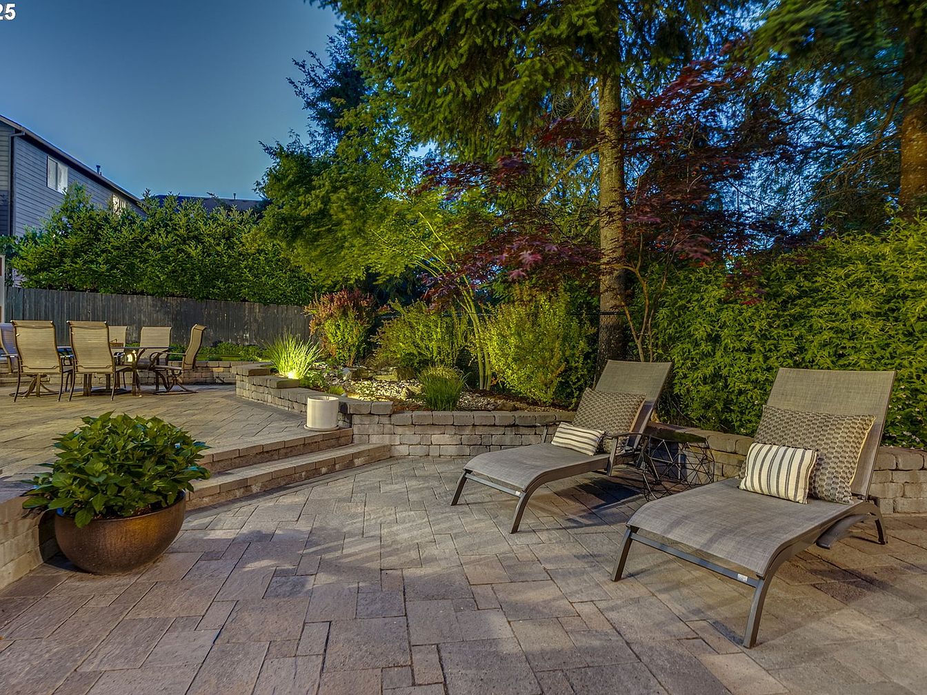 This inviting backyard patio features a spacious, multi-level stone-tiled area perfect for relaxation and outdoor gatherings. Two cushioned lounge chairs with patterned pillows are positioned on the lower level, creating a cozy spot for unwinding. A few steps lead up to a dining area with a large table and several matching chairs, ideal for alfresco meals. The surroundings are lush with various bushes, trees, and well-maintained greenery, accentuated by soft landscape lighting that adds warmth and ambiance as dusk settles. The natural tones of stone, wood, and foliage combine for a serene outdoor retreat.