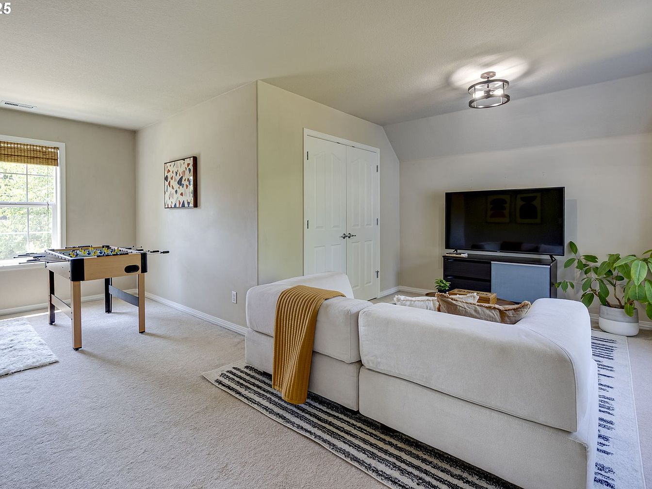 This spacious family room features a neutral color palette dominated by soft beige walls and light carpeting. A plush white sectional sofa anchors the seating area, accented with earth-toned throw pillows and a mustard-colored throw draped along the back. The sofa sits atop a modern striped area rug, enhancing the cozy atmosphere. A sleek, black TV console holds a large flat-screen television, complemented by a healthy green houseplant adding vibrancy. Natural light filters through a window with a bamboo shade. A foosball table in the corner introduces a playful element, while minimalistic abstract art decorates the wall. The overall aesthetic balances comfort with modern simplicity.