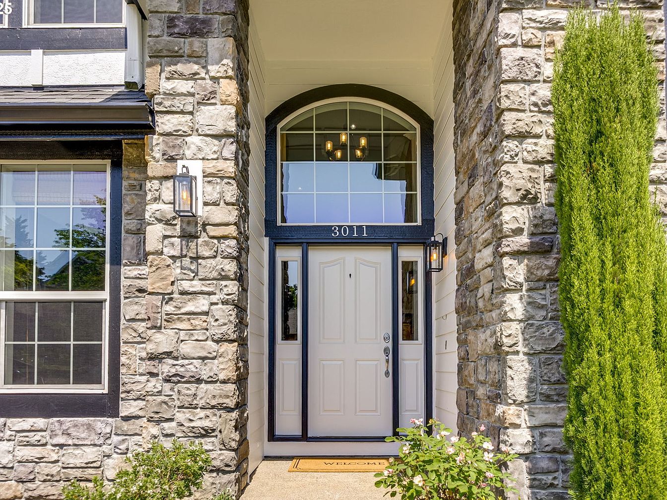 The front entryway features a stately double door painted in a soft white color, framed by tall narrow glass sidelights and a large arched transom window above, allowing natural light to flood the space. The entrance is nestled between two robust stone pillars composed of gray and beige textured stones, contributing to a rustic yet elegant curb appeal. The dark trim around the windows and door adds contrast and definition. Wrought iron lantern-style wall sconces flank the doorway, enhancing the welcoming ambiance during evening hours. Greenery, including neatly trimmed bushes and a tall leafy shrub, softens the stonework and creates a balanced, inviting entrance. A doormat labeled “WELCOME” completes the warm and hospitable aesthetic.