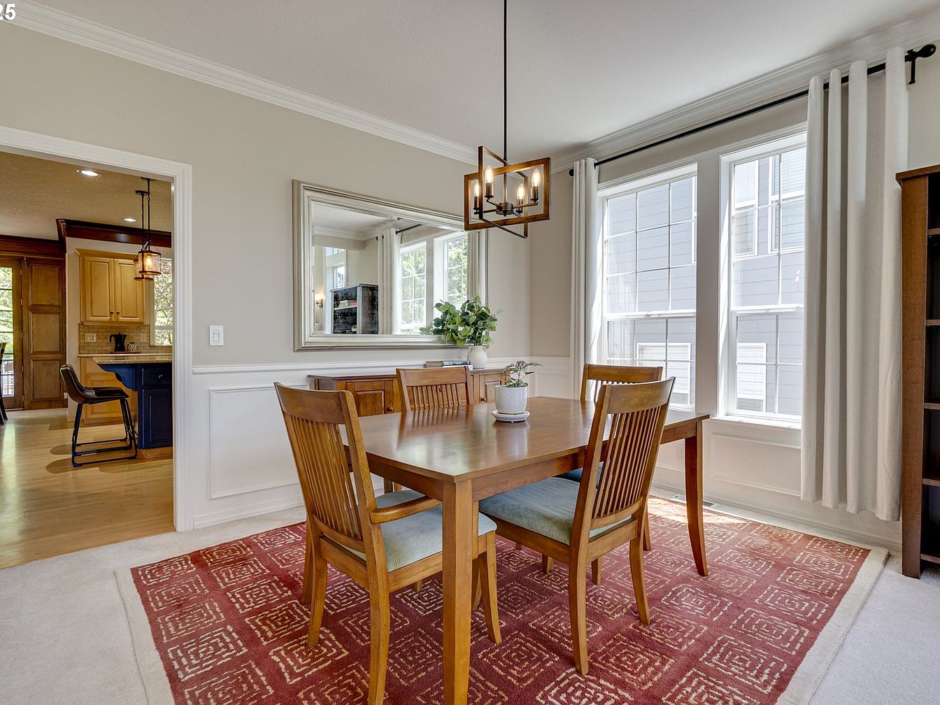 This dining room features a warm wooden table surrounded by four matching chairs with light blue cushions. A large rectangular mirror with a subtle metallic frame hangs on the soft beige wall, enhancing the sense of space and light. The floor is layered with a patterned red rug that adds warmth and a splash of color to the neutral-toned room. Crisp white wainscoting and crown molding provide elegant architectural detail. Two large windows draped with simple white curtains allow plenty of natural light to brighten the space, complementing the contemporary geometric pendant light hanging above the table. The room opens toward a kitchen area with wooden cabinetry, establishing a cozy and inviting flow.