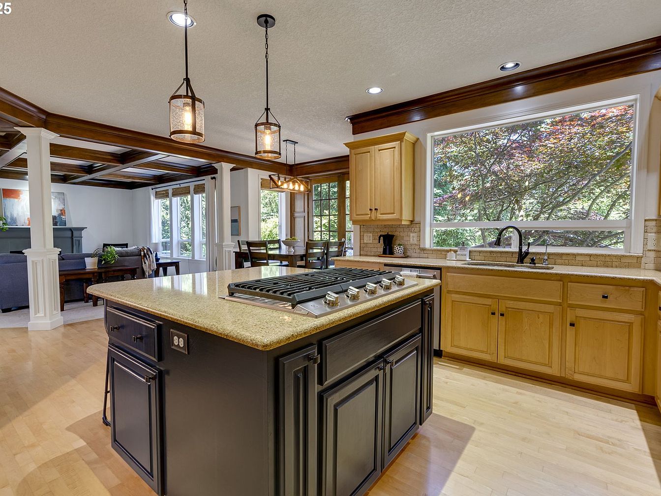 The kitchen features a spacious central island with a black finish and a granite countertop, housing a built-in gas cooktop with stainless steel knobs. Warm wooden cabinets line the perimeter, complementing the light hardwood flooring. A large window above the sink floods the space with natural light while providing a scenic view of lush greenery outside. Ornate pendant lights hang above the island, echoing the bronze accents seen throughout. Beyond the kitchen, a cozy dining area with wooden chairs and table is visible, adjacent to an inviting living room highlighted by ivory walls, classic columns, and dark wood ceiling beams adding architectural interest.