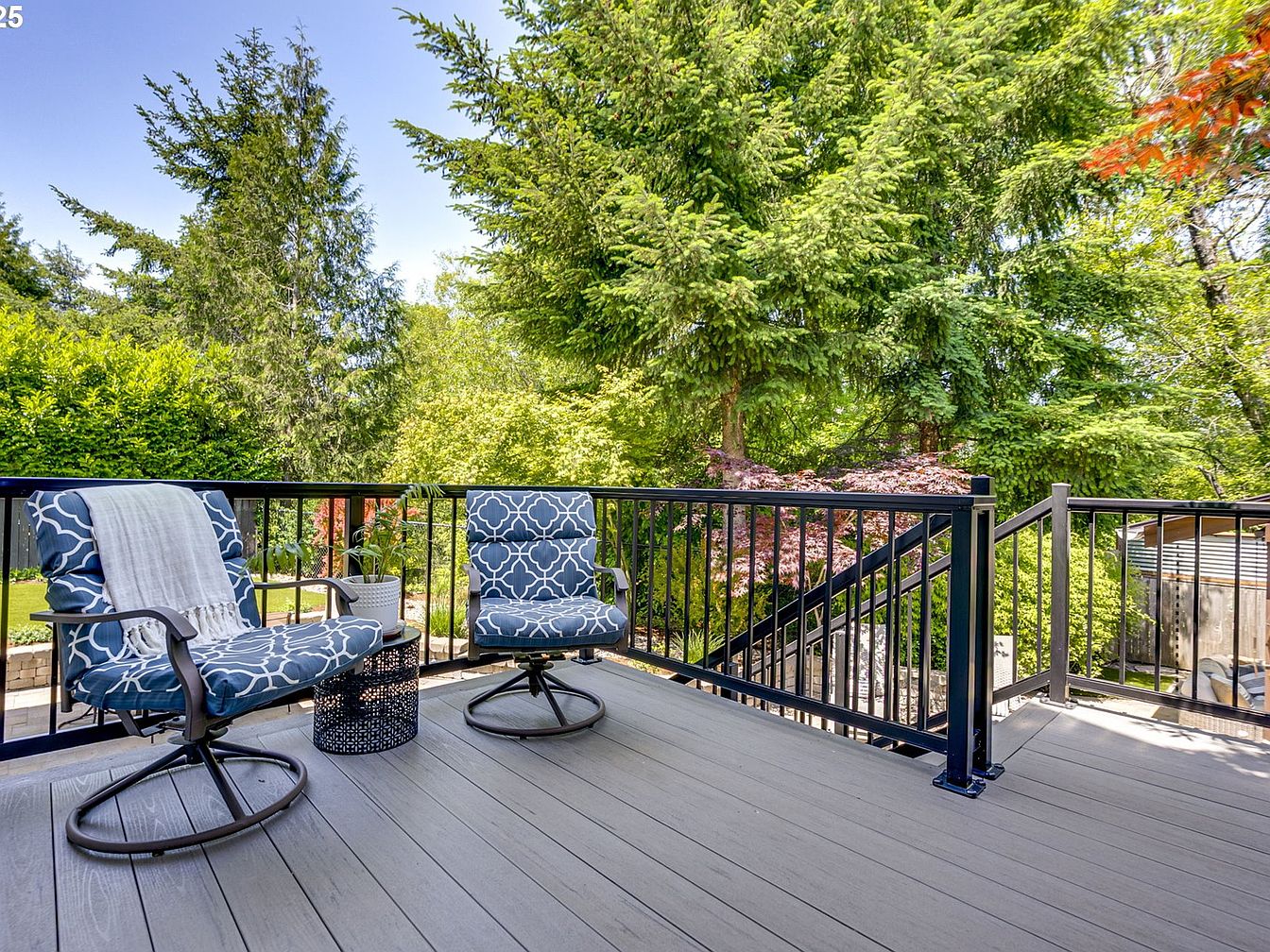 This outdoor deck area features a clean, modern design with light gray wooden flooring and sleek black metal railings offering an open view of lush greenery. Two cushioned swivel chairs with wrought iron frames are upholstered in a blue fabric with a white geometric pattern, adding visual interest and comfort. One chair has a light gray throw casually draped, enhancing the cozy vibe. A small black cylindrical side table in between brings balance and functionality to the seating space. Surrounded by tall trees and well-manicured shrubs, the deck blends naturally with the tranquil garden setting.