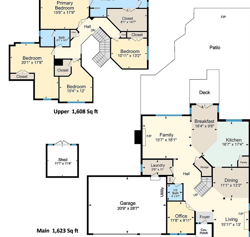 This floor plan highlights a spacious, well-organized home divided into two levels with a total of approximately 3,231 square feet. The main floor balances practical living spaces including a large garage, office, living and family rooms, a modern kitchen with an adjacent breakfast nook, and a dining area. A covered porch welcomes guests into a foyer adjacent to an office, providing a private work or study space. Upstairs, four bedrooms are arranged around a central hall, including a primary bedroom with an ensuite bath and large closets. Ample closet space and several bathrooms enhance comfort, while outdoor living is supported by a patio and deck. The overall layout emphasizes functionality, flow, and comfort for family living.