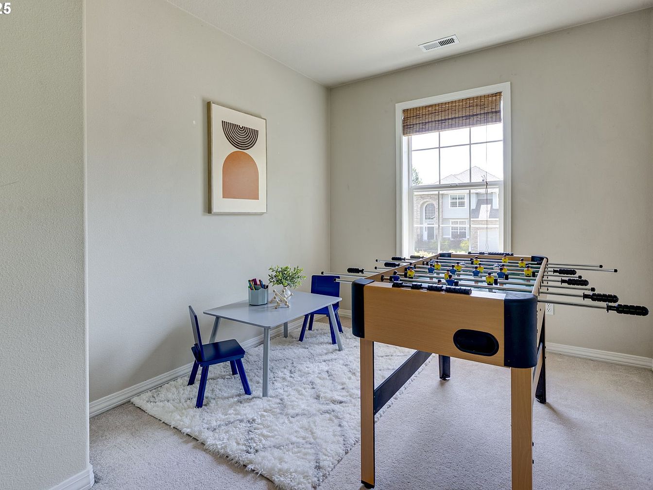 This cozy game room nook features a bright, airy layout with soft beige walls and carpeting that add warmth. Natural light filters through a large window dressed with a woven bamboo shade, enhancing the inviting atmosphere. The space balances leisure and creativity with a classic foosball table and a small children’s table setup, including two navy blue chairs and a simple gray tabletop atop a fluffy white rug. Minimalist wall art adds a modern geometric touch, while small decorative elements like a plant and colorful pens complete the playful yet calming vibe of the room.