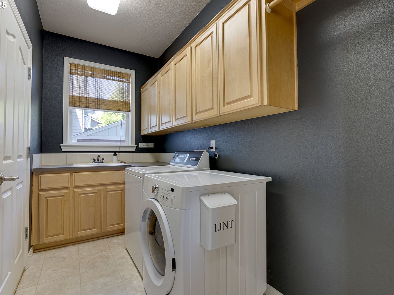 This laundry room features a clean, functional layout with a side-by-side washer and dryer positioned beneath light wood cabinetry that extends along the length of one wall, providing ample storage space. The walls are painted in a dark charcoal gray, creating a modern contrast with the natural wood tones of the cabinetry and the white appliances. A single window with a woven bamboo shade filters natural light, overlooking an outdoor area. The beige tiled floor adds warmth and practicality. A small white lint bin attached to the dryer enhances organization. The room is bright, efficient, and thoughtfully designed for everyday chores.