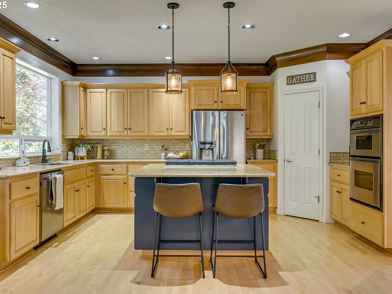This spacious kitchen features a central island with a polished stone countertop in a neutral tone, contrasted by its deep blue base. Two modern pendant lights with glass shades hang above the island, adding warmth and focused lighting. The surrounding cabinetry is crafted from light wood with simple, classic paneling, providing a cozy yet refined atmosphere. Stainless steel appliances, including a double wall oven and a French door refrigerator, enhance functionality and style. The light hardwood floor complements the cabinetry, while a crown molding detail in a darker wood frames the ceiling, adding architectural interest. A large window by the sink invites natural light, brightening the space. A “GATHER” sign above the white pantry door adds a charming, welcoming touch.