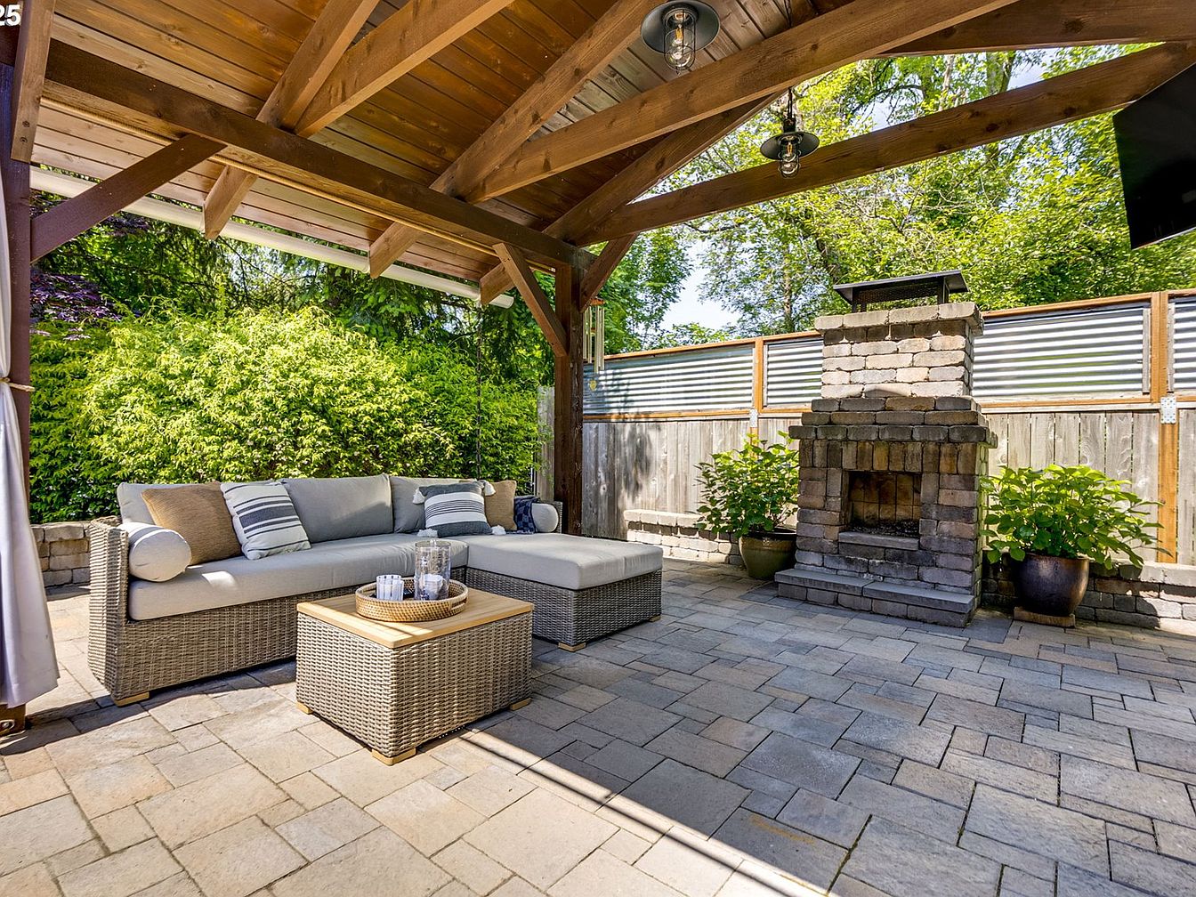 This outdoor living area features a sturdy wooden pergola overhead with exposed beams enhancing the rustic charm. The flooring consists of light gray stone pavers laid in a neat pattern, complementing the natural tones of the space. A woven rattan sectional sofa with beige cushions and striped pillows adds comfort and a casual elegance. Central to the space is a matching rattan coffee table with a wooden top, holding decorative candles. A stone fireplace anchors one side, flanked by potted plants, creating a cozy ambiance while privacy fencing blends corrugated metal and wood, adding a modern, industrial touch amidst the lush greenery.