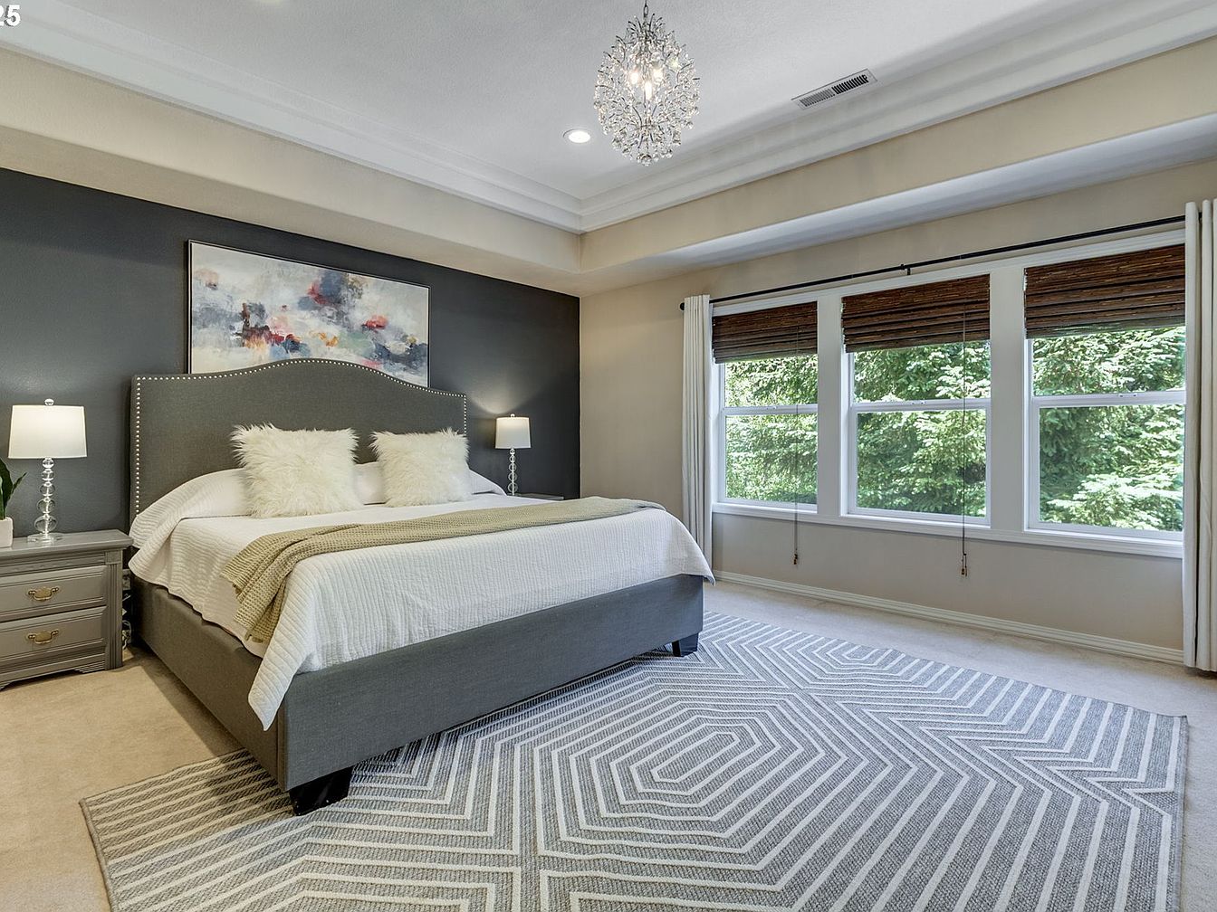 This serene master bedroom corner exudes a cozy yet refined ambiance. A plush, upholstered gray bedframe with a high, curved headboard anchors the space, flanked by matching nightstands in a muted gray tone, each topped with glass-based lamps emitting soft light. The accent wall behind the bed in a deep charcoal contrasts elegantly with the lighter surrounding walls. Artistic touches include a large, abstract painting with soft, cloud-like colors above the bed and white fluffy throw pillows adding texture. Natural light filters through three sizable windows adorned with white curtains and wooden blinds. A geometric patterned gray and white rug grounds the corner, while a crystal chandelier hanging from the tray ceiling adds a hint of glamour.