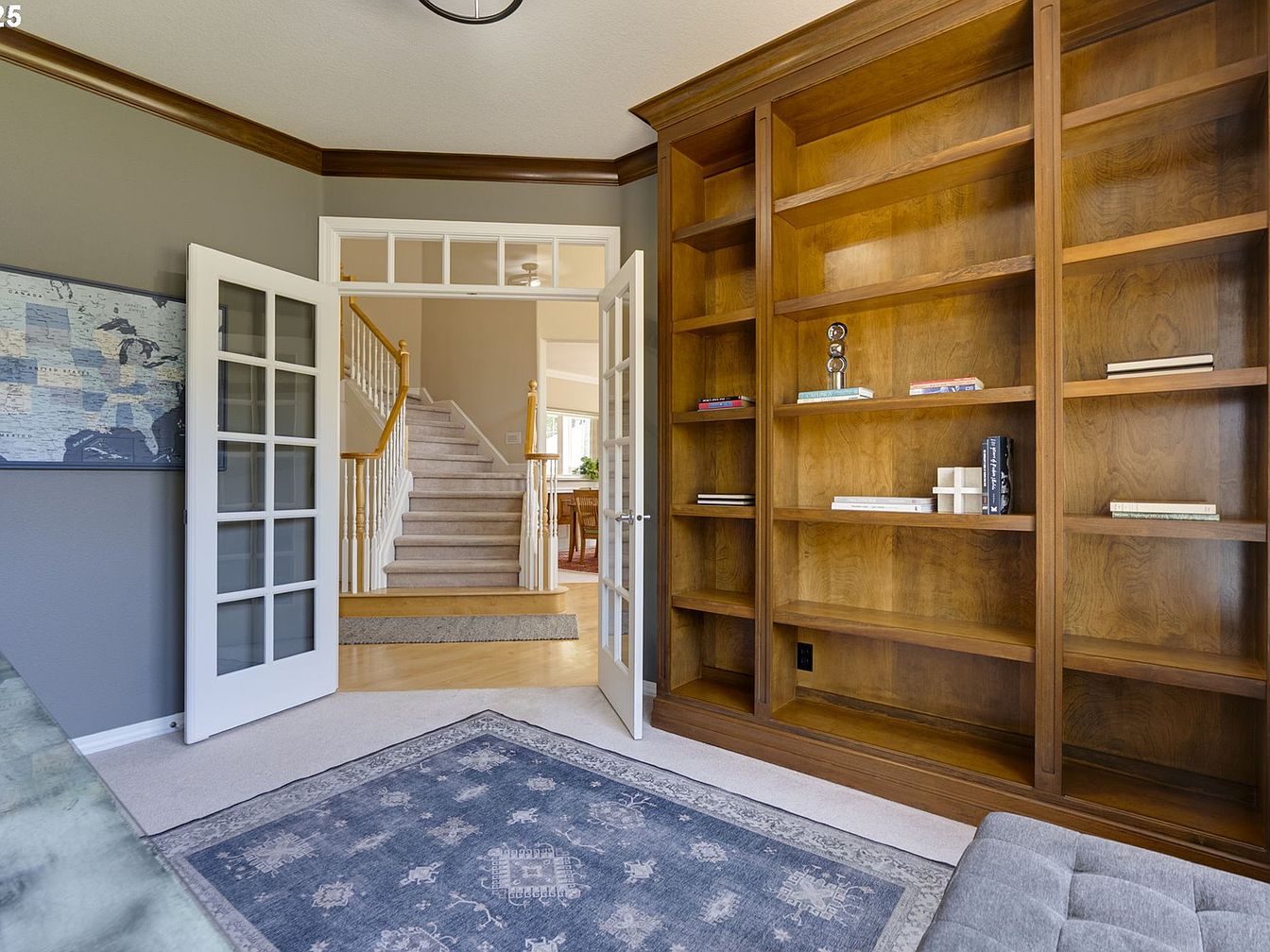 This space serves as a cozy home office or study, featuring a large built-in wooden bookshelf with a warm, natural finish that adds character and ample storage. The walls are painted in a muted gray tone, complemented by rich wood crown molding that adds elegance. French doors with glass panes invite natural light while maintaining visual connection to the rest of the home. Nearby, a staircase with white spindles and wood handrails leads to upper floors. A patterned blue-gray rug softens the light carpet floor, enhancing the room’s welcoming ambiance.