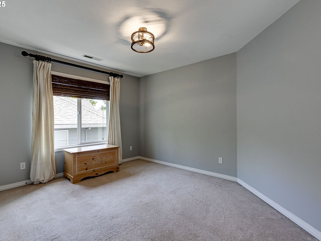 This small bedroom nook features soft gray walls paired with a light beige carpet, creating a calm and neutral backdrop. A single window framed with dark curtain rods, cream-colored curtains, and dark wood blinds provides natural light and privacy control. Below the window is a sturdy, rustic wooden chest in a natural finish, adding warmth and a touch of traditional charm. The ceiling light fixture, with its bronze circular frame and exposed bulbs, introduces a subtle modern-industrial element. The overall simplicity and muted tones highlight an inviting and versatile space perfect for relaxation or a personal corner.