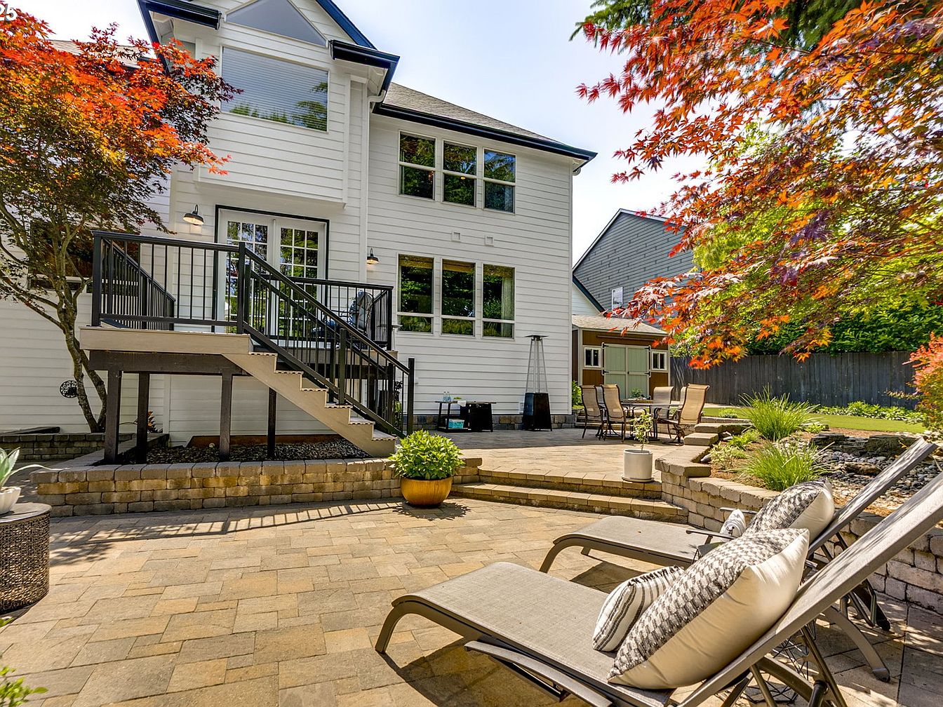 This backyard patio features a spacious, multi-level stone paver design that blends seamlessly with the white exterior siding of the house. A black metal railing and staircase provide access from the back door to the lower patio level, emphasizing modern yet sturdy elements. Comfortable lounge chairs with neutral-toned cushions and patterned throw pillows invite relaxation under the shade of a vibrant tree with red-orange foliage. The upper section hosts a casual outdoor dining set beside a cozy fire pit heater, surrounded by lush greenery and a tall privacy fence, creating a serene and private outdoor retreat.