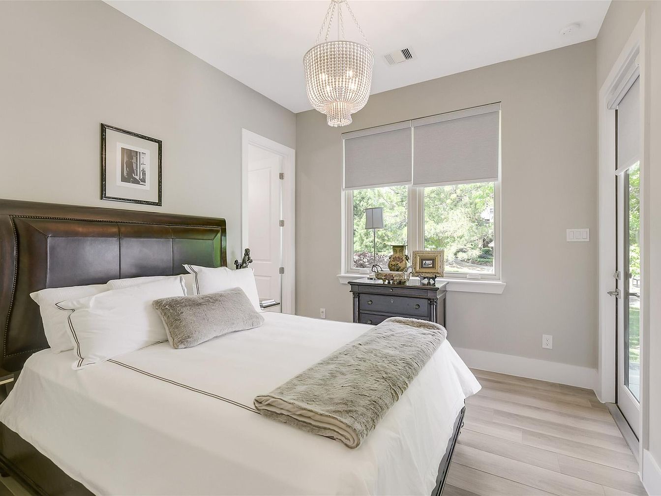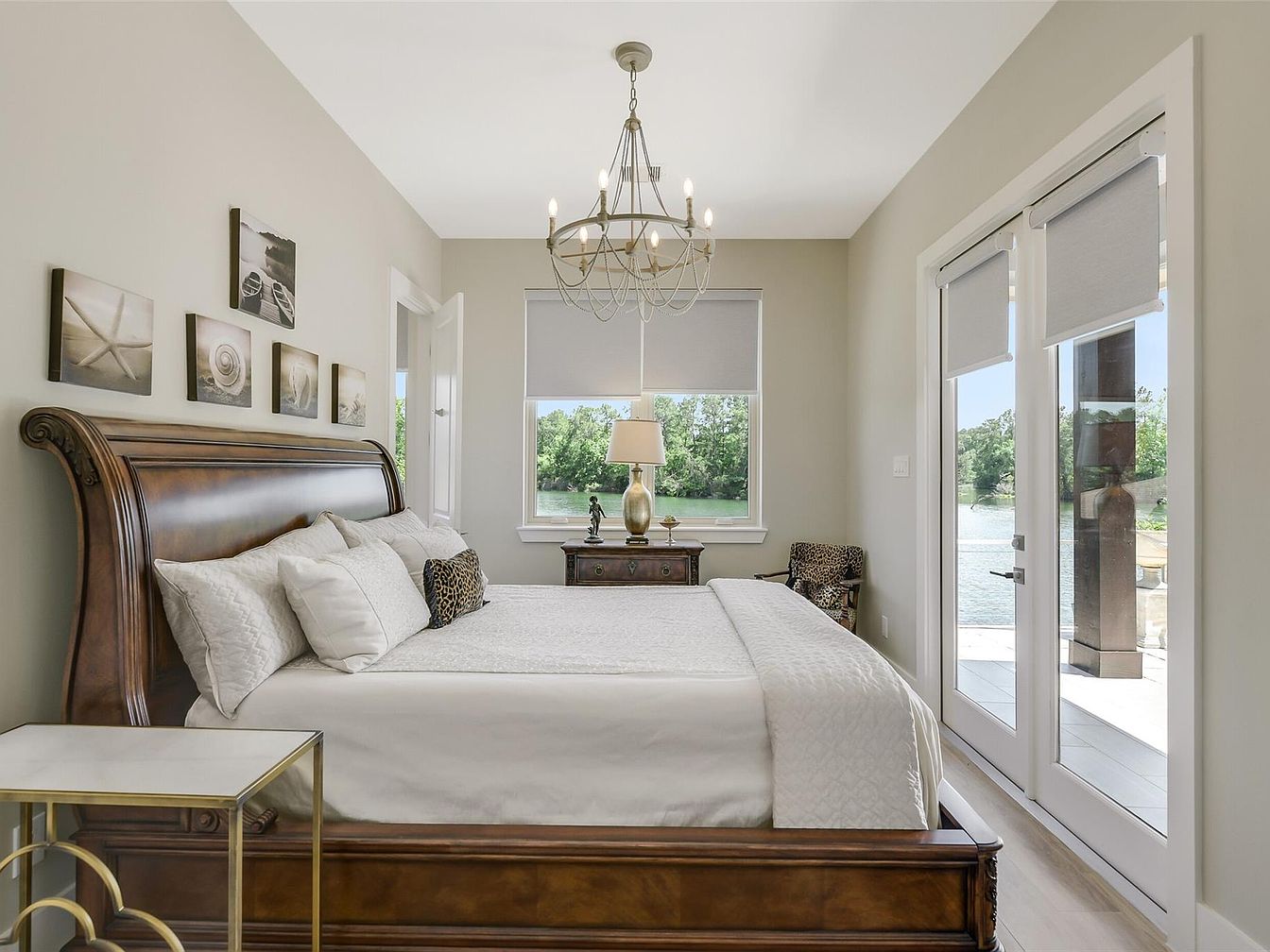 This master bedroom features a classic wooden sleigh bed with an elegant rich brown finish, complemented by crisp white bedding and soft pillows. The walls are painted a neutral beige, creating a serene backdrop that enhances natural light flooding through a large window and glass French doors, offering stunning lake views. Above the bed, a series of small minimalist coastal-themed artworks add a touch of tranquility. A vintage wooden dresser with a decorative lamp and a cozy leopard-print accent chair in the corner provide functional charm. A delicate chandelier hangs overhead, tying the room’s classic and contemporary styles together.