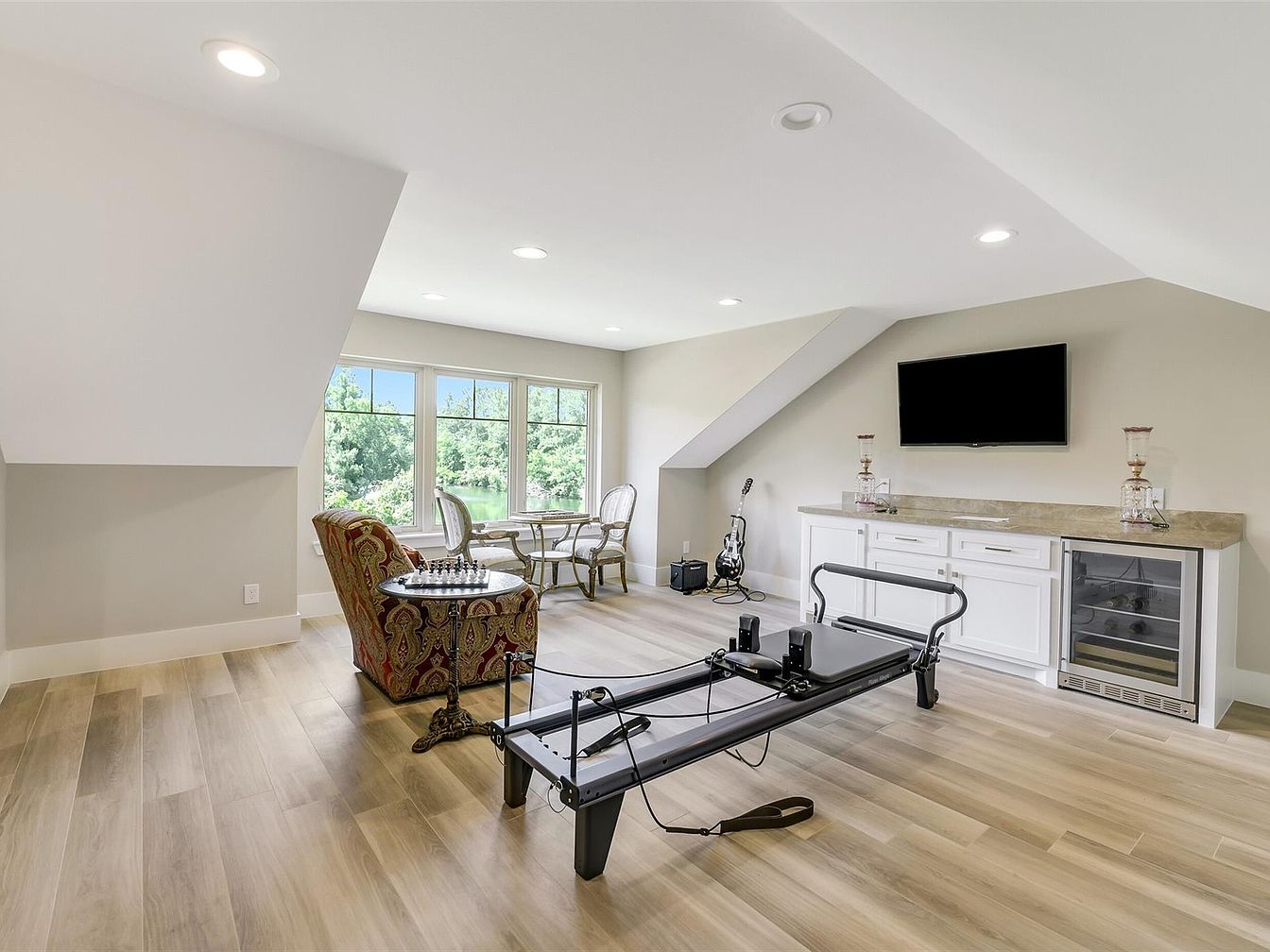 This bright and spacious recreation area features a modern multi-use layout with sloped ceilings adding character and intimacy. Light wood flooring complements the soft beige walls, creating a warm and inviting atmosphere. An exercise reformer machine sits centrally, ideal for fitness enthusiasts, while a cozy patterned armchair with an ornate side table invites relaxation or chess play. Near a large triple window flooding the space with natural light, a small dining set provides a peaceful spot for games or casual meals. A built-in cabinetry wall with a wine cooler and mounted TV enhances function and entertainment.