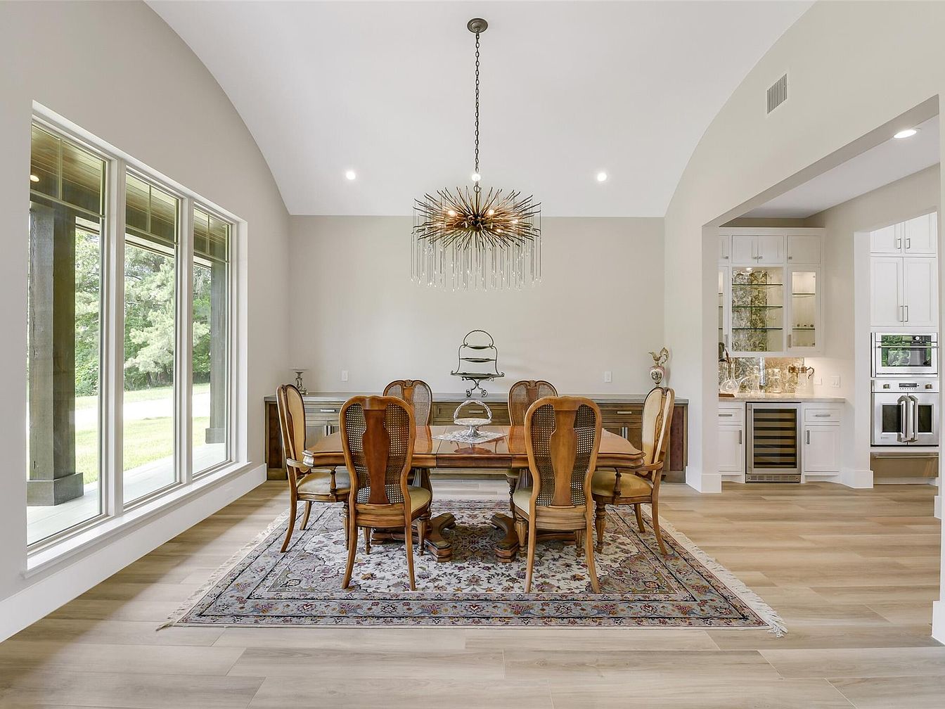 This elegant dining room features a classic wooden table surrounded by six intricately designed chairs with woven backs. The space is grounded by a richly patterned area rug that adds warmth and texture against the light, wood-look flooring. A striking chandelier, resembling a burst of radiating rods with hanging crystals, illuminates the room from the vaulted white ceiling, enhancing the sophisticated ambiance. Floor-to-ceiling windows on one side fill the room with natural light and provide views of greenery outside. To the right, an open archway leads to a modern kitchen boasting white cabinetry, a wine cooler, and built-in appliances, blending traditional charm with contemporary design.