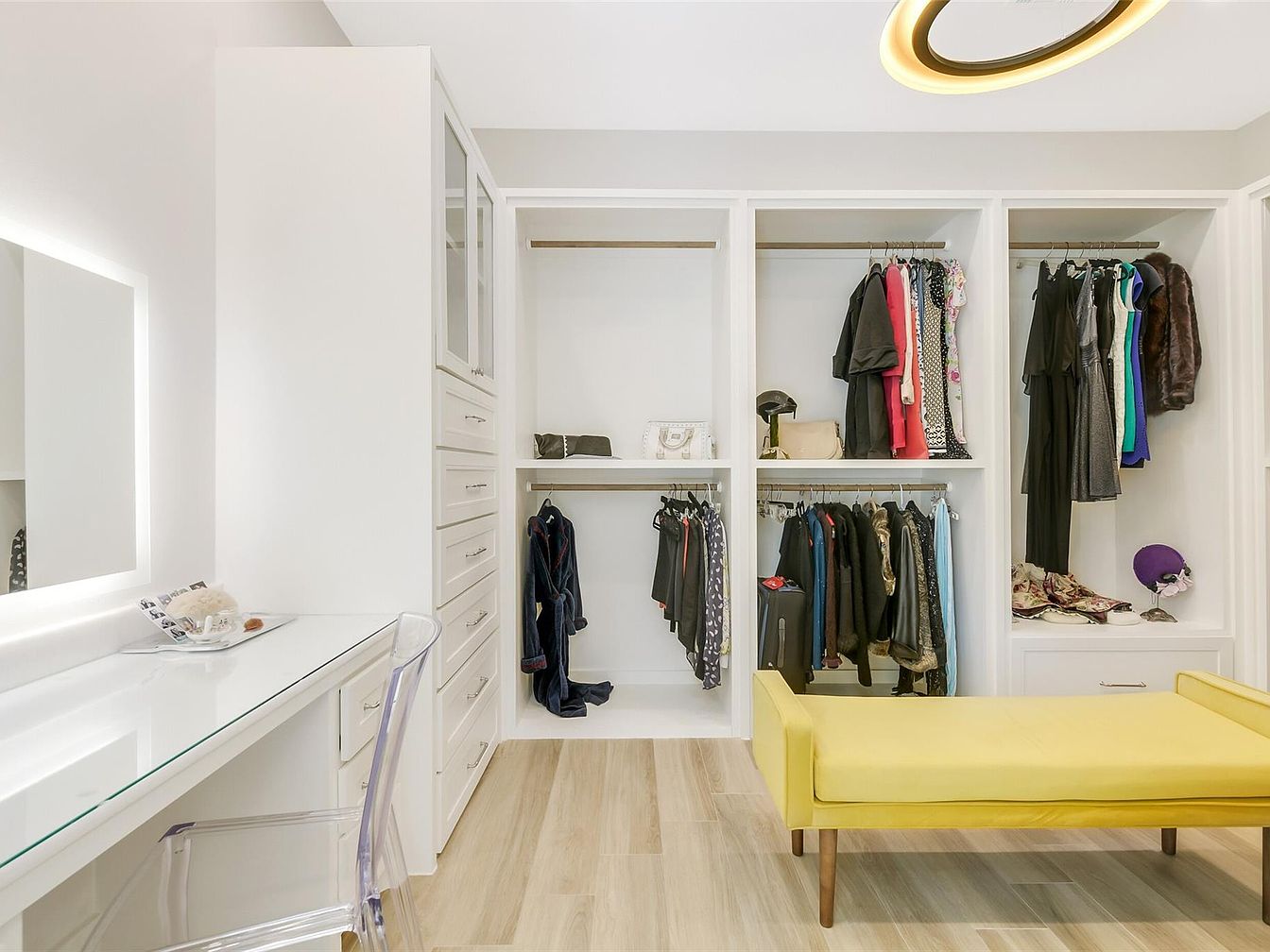 This walk-in closet blends modern organization with a subtle burst of color. White built-in shelves and drawers dominate one wall, providing ample space for hanging clothes, accessories, and folded items. The closet rods are brushed gold, adding a hint of elegance to the otherwise neutral color palette. The flooring consists of sleek light wood planks, enhancing the room’s bright and airy atmosphere. Opposite the storage units, a yellow upholstered bench offers a cheerful seating option. Adjacent is a white vanity table with a large backlit mirror paired with a transparent acrylic chair, perfect for dressing and grooming routines. The overall style is contemporary and clean, mixing functionality with a cheerful, minimalist vibe.