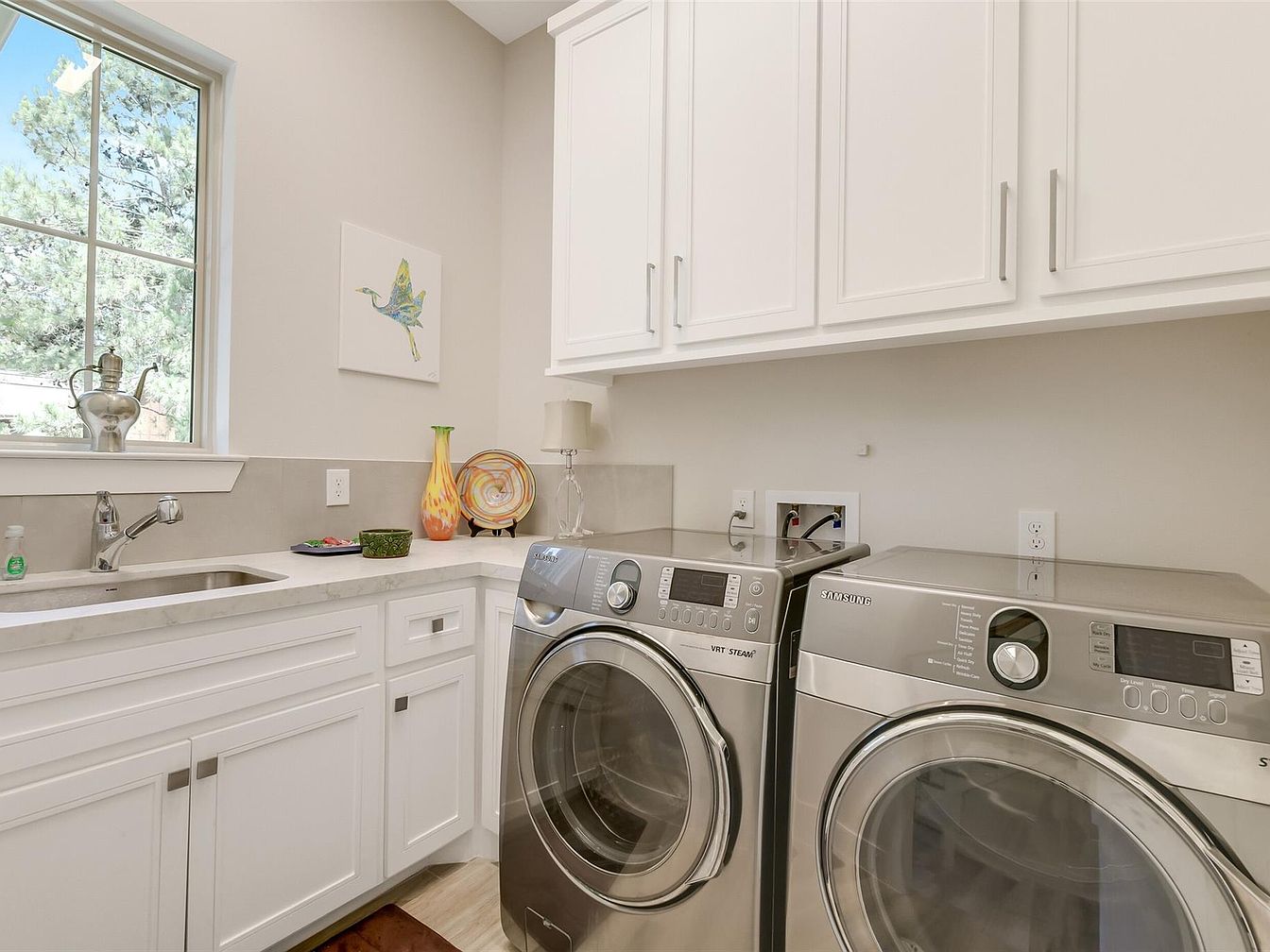 This laundry area features a clean, modern design with white cabinetry both above and below spacious countertops, providing ample storage and workspace. The stainless steel front-loading washer and dryer units add a sleek, contemporary touch. A single window allows natural light to brighten the space and offers a view of green foliage outside. The walls are painted in a soft, neutral tone that complements the white cabinets and light wood flooring. Decorative items, including a colorful vase, a plate, and a bird art piece, add subtle character and warmth to this practical yet stylish utility room.