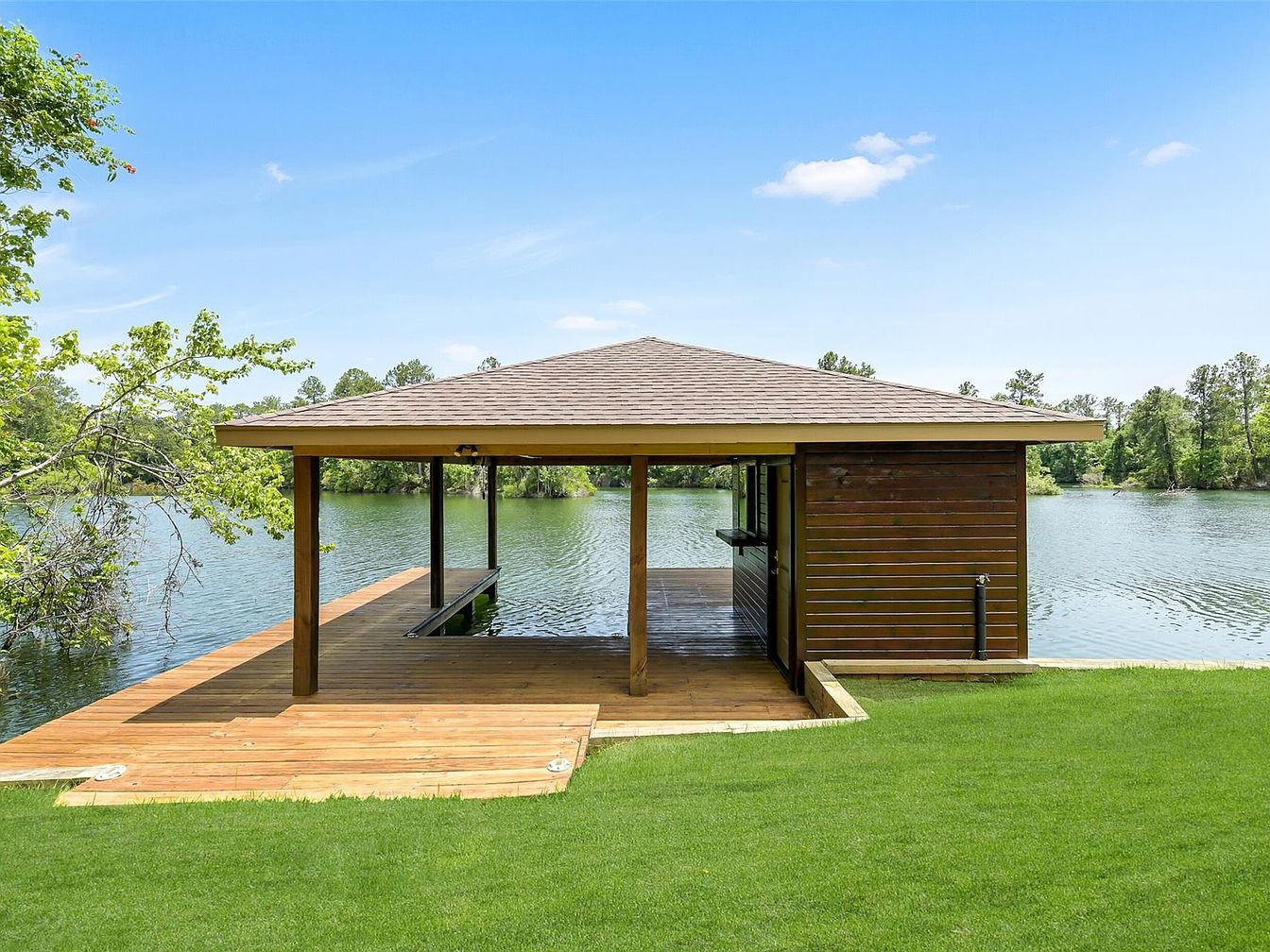 This serene lakefront boat dock features a spacious wooden platform extending onto the water, offering ample space for boats and leisurely activities. A pitched roof with subtle earth tones shelters a portion of the dock, providing shade and protection. The warm wood finish of the structure blends harmoniously with the surrounding lush greenery and vibrant green lawn, creating a natural connection to the outdoors. The open design invites unobstructed views of the peaceful lake and nearby trees, making it an ideal spot for relaxation and enjoying waterfront living.
